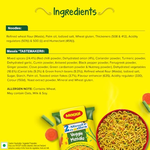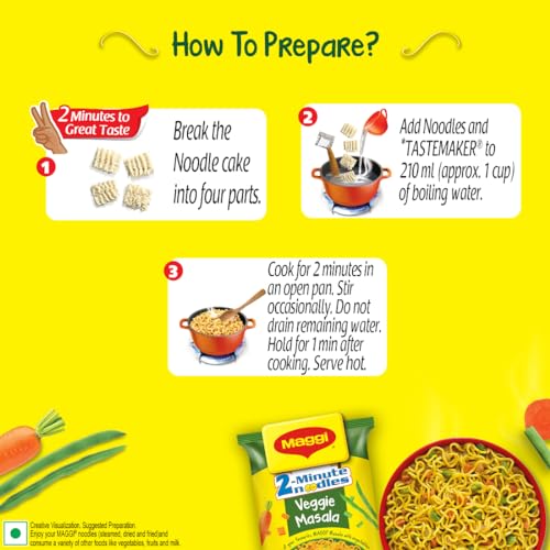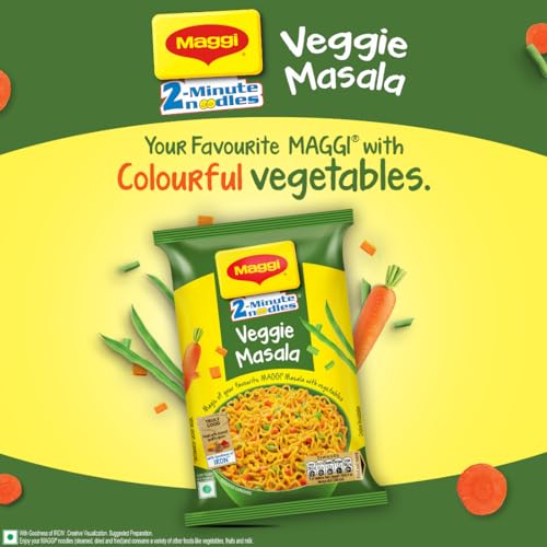 Maggi introduces the new Veggie Masala noodles which will turn your hunger into happiness. Enjoy the same great taste of Maggi with exciting and colourful veggies like carrots & beans. Experience the joy of cooking with Maggi Veggie instant noodles as it is easy to cook and already contains colourful veggies. Give your kids a perfect solution to their hunger with oh-so-yummy Maggi Veggie noodles. Usage : 1. Break the Noodle cake into four parts. 2. Add Noodles and TASTEMAKER to 210 ml (approx. 1 cup) of boiling water. 3. Cook for 2 minutes in an open pan. Stir occasionally. Do not drain remaining water. Hold for 1 min after cooking. Serve Hot. Storage instructions : Store in cool dry & hygienic place.