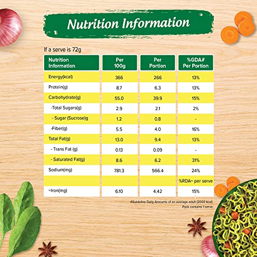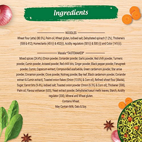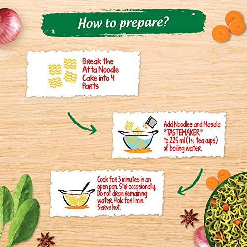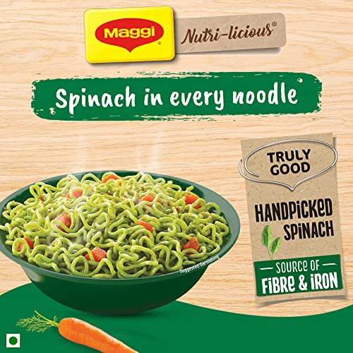 Make ordinary moments extraordinary with the new Maggi Veg Atta which now comes with an awesome surprise of âSpinach in every noodleâ. It has an appetizing aroma and delicious masala taste made using 20 spices and herbs. Maggi Nutri-licious Masala Veg Atta Noodles with handpicked spinach are truly a good combination of delicious and tasty wheat flour (atta) spinach colourful vegetables & 20 spices & herbs. Maggi Nutri-licious Masala Veg Atta Noodles with spinach is also a great source of fibre & iron making it a deliciously filling meal. STORAGE INSTRUCTIONS: Store in a cool dry & hygienic place to protect from insects pests & strong odours.