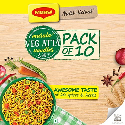 Introducing the Maggi Nutri-licious Masala Veg Atta Noodles with appetizing aroma and delicious masala taste made using 20 spices & herbs. These masalas are roasted to perfection for an aroma & flavour which you will love. These Maggi Nutri-licious Masala Veg Atta Noodles are truly a good combination of delicious and nutritious wheat flour (Atta) colourful vegetables & the awesome taste of 20 spices & herbs. Enjoy a perfect snacking experience and make family time more awesome with this pack of 10 Maggi Nutri-licious Atta Masala Noodles. Each serving (72.5g) of the Maggi Masala Veg Atta Noodles is a Source of Fibre & Iron (Refer pack for more details). USAGE INSTRUCTIONS: Making Maggi Nutri-licious Masala Veg Atta Noodles is as easy as it could ever be - Break the Atta Noodle cake into four parts. Add noodles and Masala Tastemaker to 225 ml (1 ½ tea cups) of boiling water. Cook for 3 minutes in an open pan. Stir occasionally. Do not drain the remaining water. Hold for 1 minute. Serve hot. STORAGE INSTRUCTIONS: Store in a cool dry & hygienic place to protect from insects pests & strong odours. Allergen information: May contain Milk and Soya
