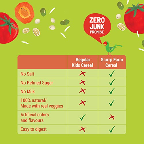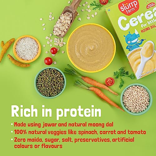Slurrp Farm Instant Moong Dal Khichdi for Little Ones | No Sugar | No Salt | No Milk | Healthy Cereals for Kids with Real Vegetables | Great for Travel | Easy to digest 200gIngredients: Jowar(Sorghum) Moong Dal Oats Tomato Powder Carrot Powder Turmeric Powder Cumin Powder Coriander Powder Vitamins and Minerals | How to Use: 1. Add 1/2 cup of water into a pan 2. Add 3 level table spoons (30 gms) of Moong Dal Khichdi 3. Mix well to remove the lumps 4. Cook on a medium flame for 3-5 mins and stir continuously to avoid lumps 5. Cool to room temperature and feed immediately | Once the pack is opened transfer the contents to an airtight container store in cool dry place or in a refrigerator | At Slurrp Farm brand made by 2 Mothers we are passionate about raising awareness of healthy eating for children and giving busy parents like us the convenience needed in terms of being able to find food options which are as good as what we would make at home.Slurrp Farm No Maida Millet Noodles | Not Fried No MSG | Foxtail Millet and Little Millet Noodles Combo | Pack of 2-192g EachNo maida refined sugar and palm oil not fried