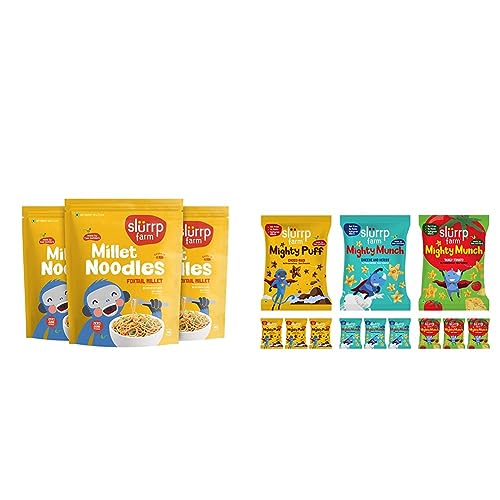 Slurrp Farm No Maida Millet Noodles | Not Fried No MSG | Foxtail Millet Noodles Pack of 3-192g EachNo maida refined sugar and palm oil not friedSlurrp Farm Healthy Snacks for Kids | Mighty Puff Choco Ragi Cheese & Herbs and Tangy Tomato| Not Fried No Maida | Snack for School Tiffin and Travel-Friendly | 12 x 20g packsSlurrp farm non-fried puffs are 100 percent natural filled with the goodness of super grains like ragi and jowar.
