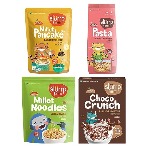 Slurrp Farm 7AM to 7PM combo pack of Millet Banana Choco-Chip Pancake Macaroni Pasta Millet Noodles and Mighty Crunch are healthy options that will perk up your mornings study breaks tiffin time snack time & more!