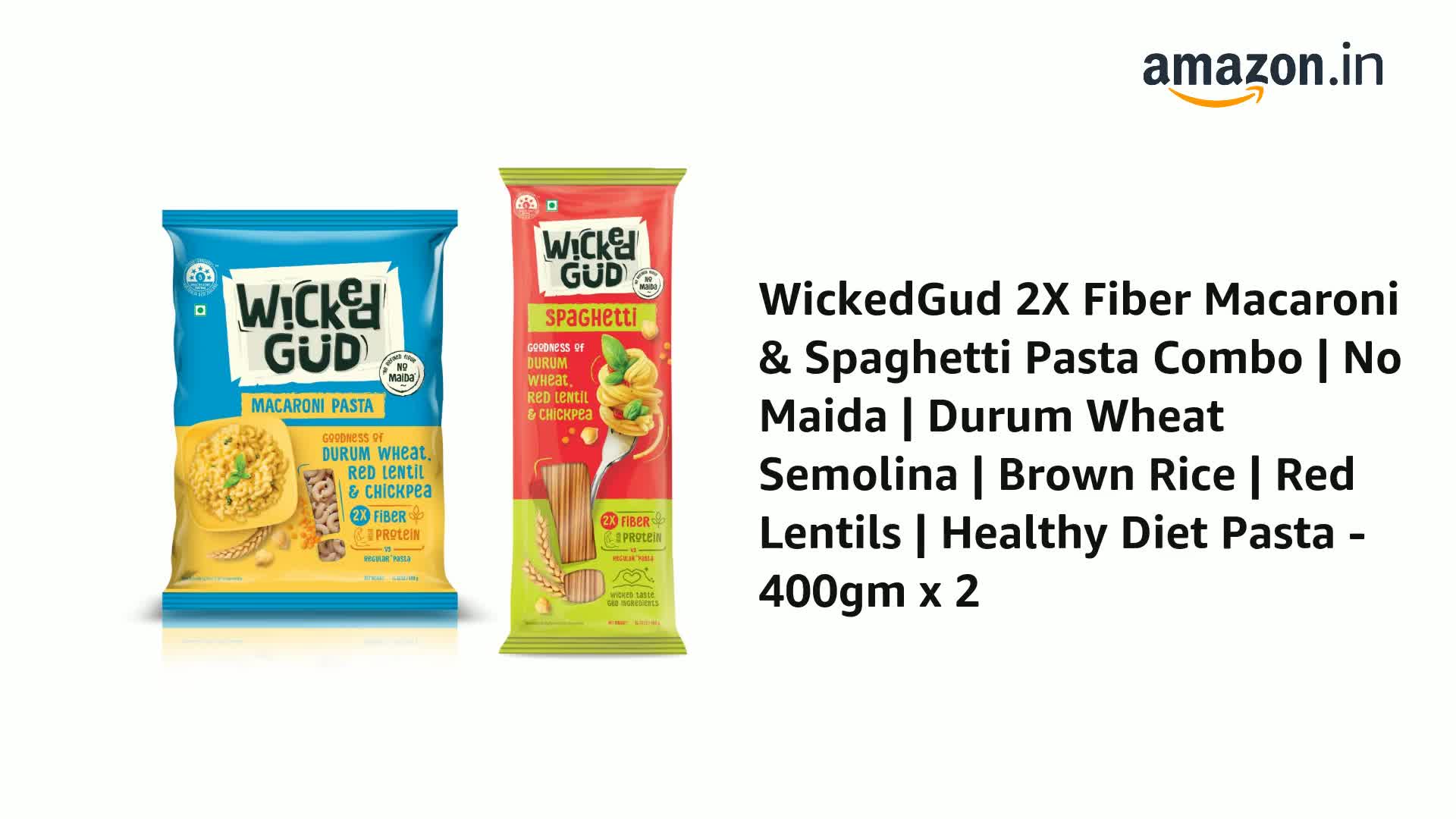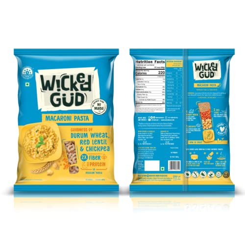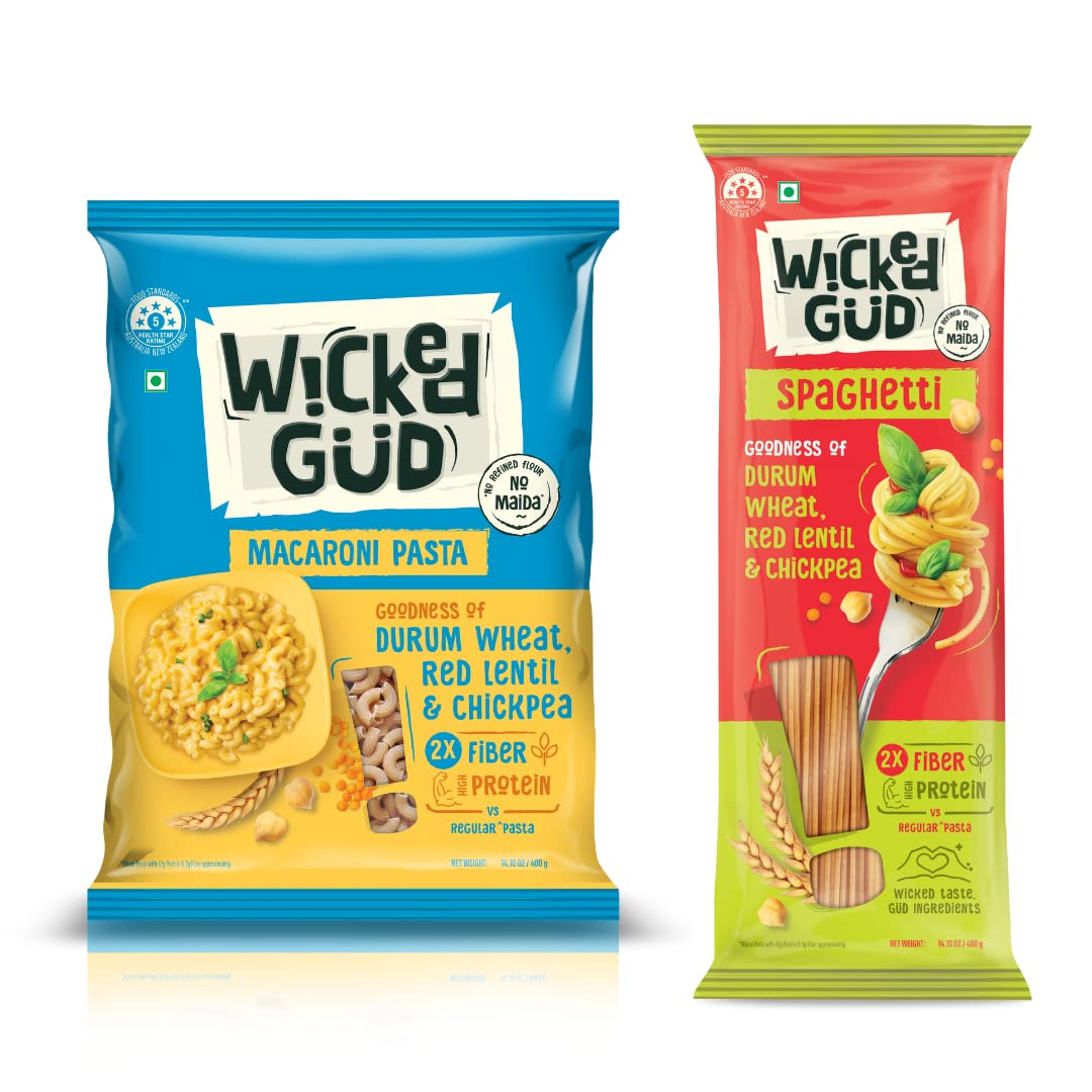 HomeGroceryInstantPasta & NoodlesWickedGud 2X Fiber Macaroni & Spaghetti Pasta Combo | No Maida | Durum Wheat Semolina | Brown Rice | Red Lentils | Healthy Diet Pasta - 400gm x 2