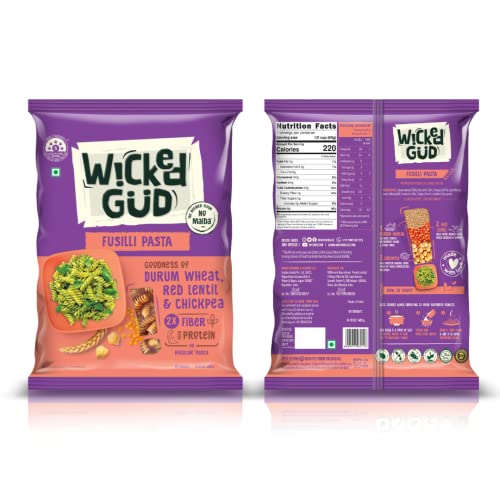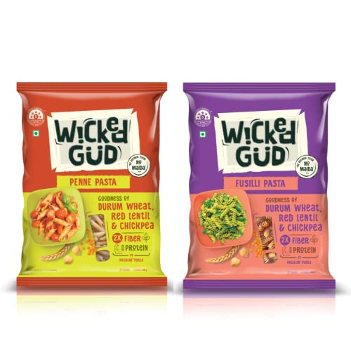WickedGud 2X Fiber Penne & Fusilli Pasta Combo | No Maida | Durum Wheat Semolina | Brown Rice | Red Lentils | Healthy Diet Pasta - 400gm x 2