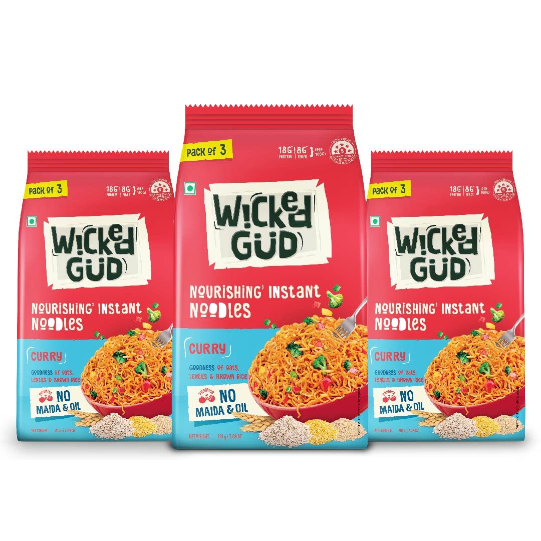 HomeGroceryInstantPasta & NoodlesWickedGud Nourishing Curry Instant Noodles (201gm x 3) | Healthy Noodles | No Maida | No Oil | No MSG | High Protein | High Fibre | Cholesterol Free