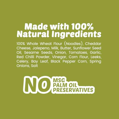 • 100% Whole wheat instant noodles made in a scrumptious Cheddar cheese sauce topped with Jalapenos