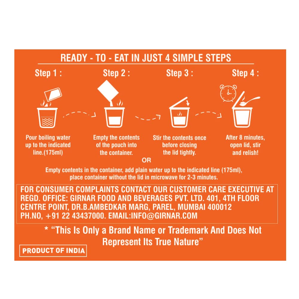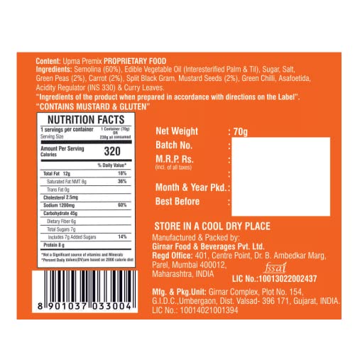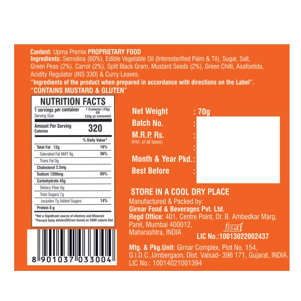 A wholesome and delicious meal prepared with Indian spices and flavors. Samolina Edible Vegetable Oil Sugar Salt Green Peas Carrot Split Black Gram Mustard Seeds Green Chilli Asafoetida Acidity Regulator & Curry Leaves.