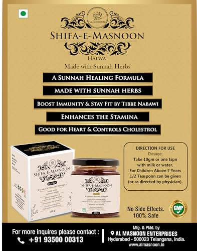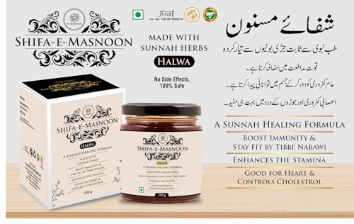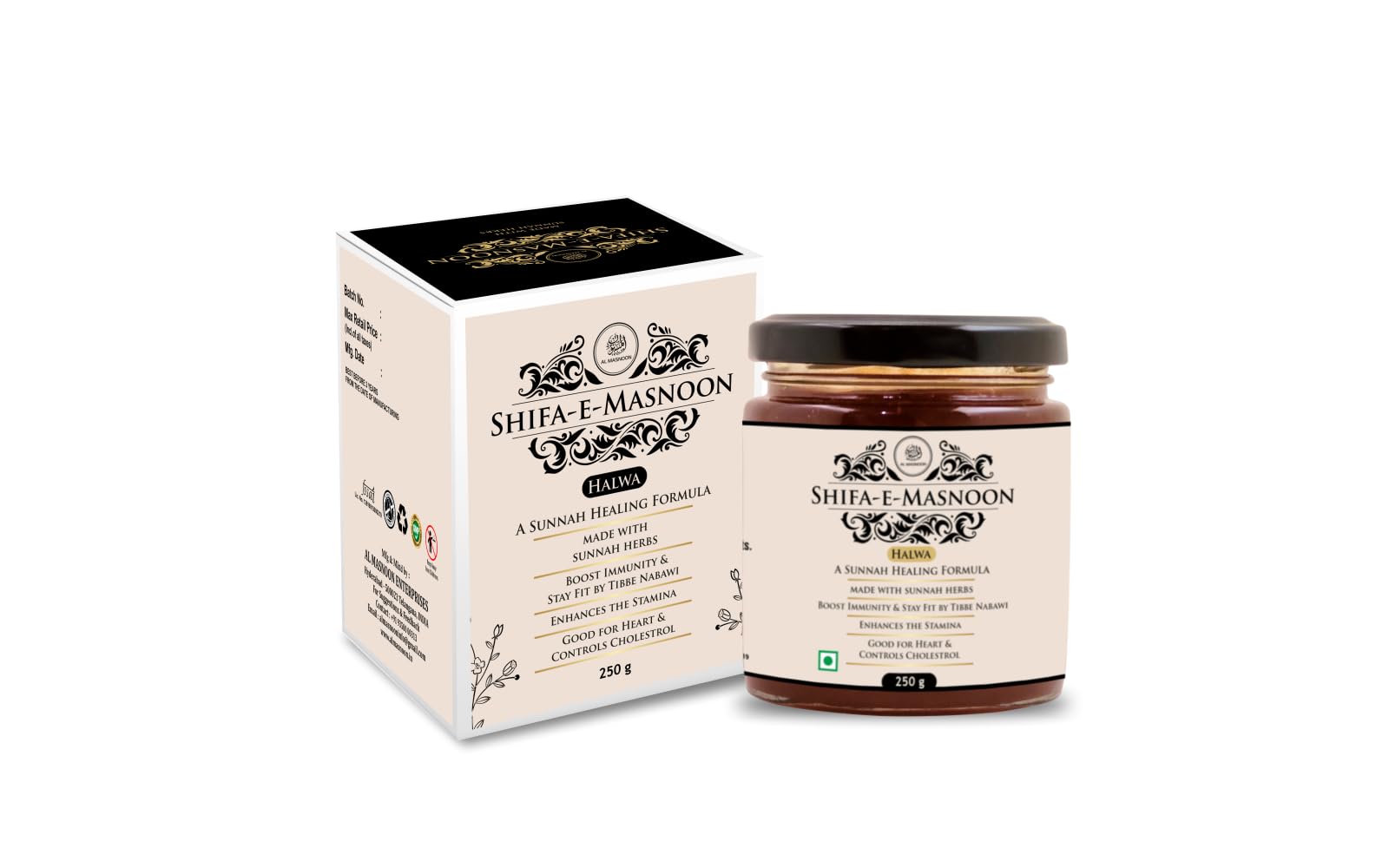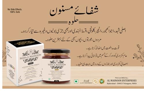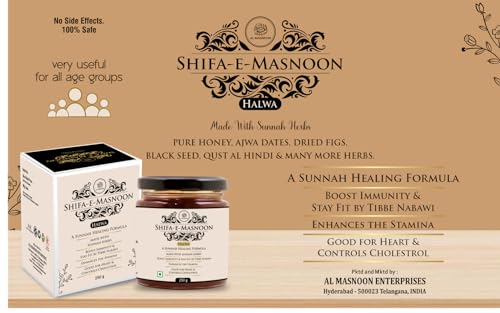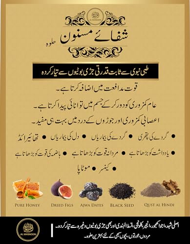 • AL MASNOON Shifa-e-Masnoon paste made with pure honey ajwa dates & sunnah herbs like qust al hindi kalonji dried figs & many more