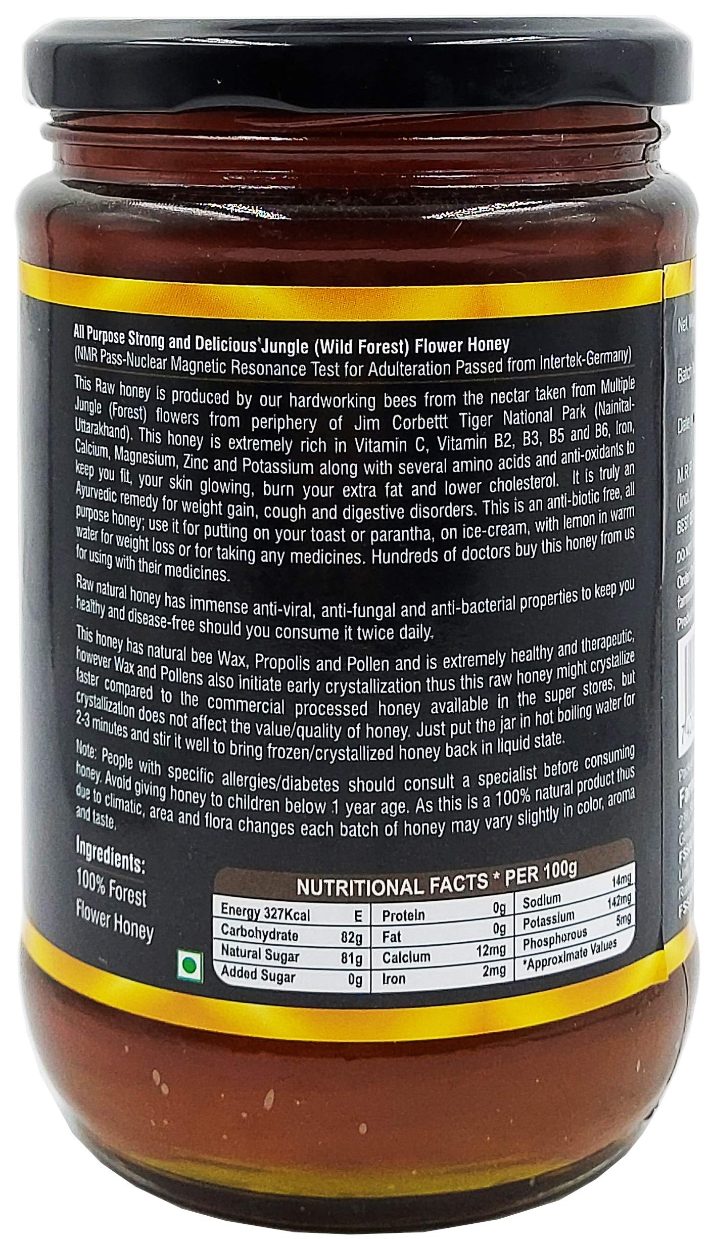 • This Raw honey is produced by our hardworking bees from the nectar taken from Multiple Jungle (Forest) flowers from periphery of Jim Corbettt Tiger National Park (Nainital-Uttarakhand)