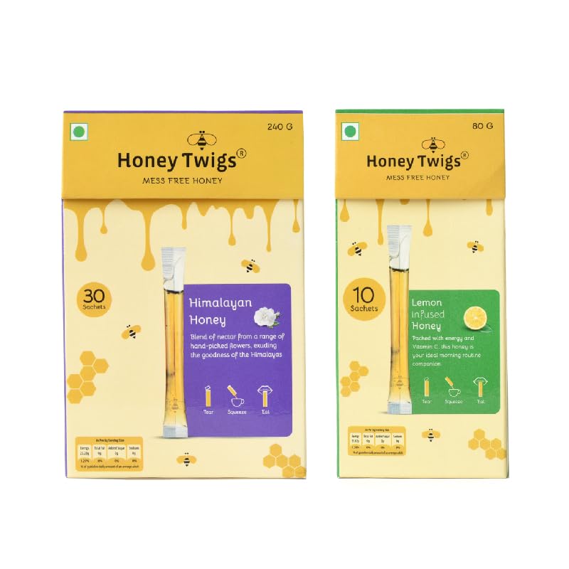 Honey Twigs Natural Honey | Himalayan Multi Floral Honey and Lemon Honey 320g(240g + 80g - 40 Twigs) | Infused with Natural Ingredients | Pure Honey | No Added Color | No Preservatives