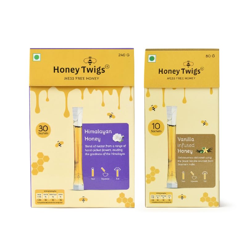Honey Twigs Natural Honey | Himalayan Multi Floral Honey and Vanilla Honey 320g(240g + 80g - 40 Twigs) | Infused with Natural Ingredients | Pure Honey | No Added Color | No Preservatives