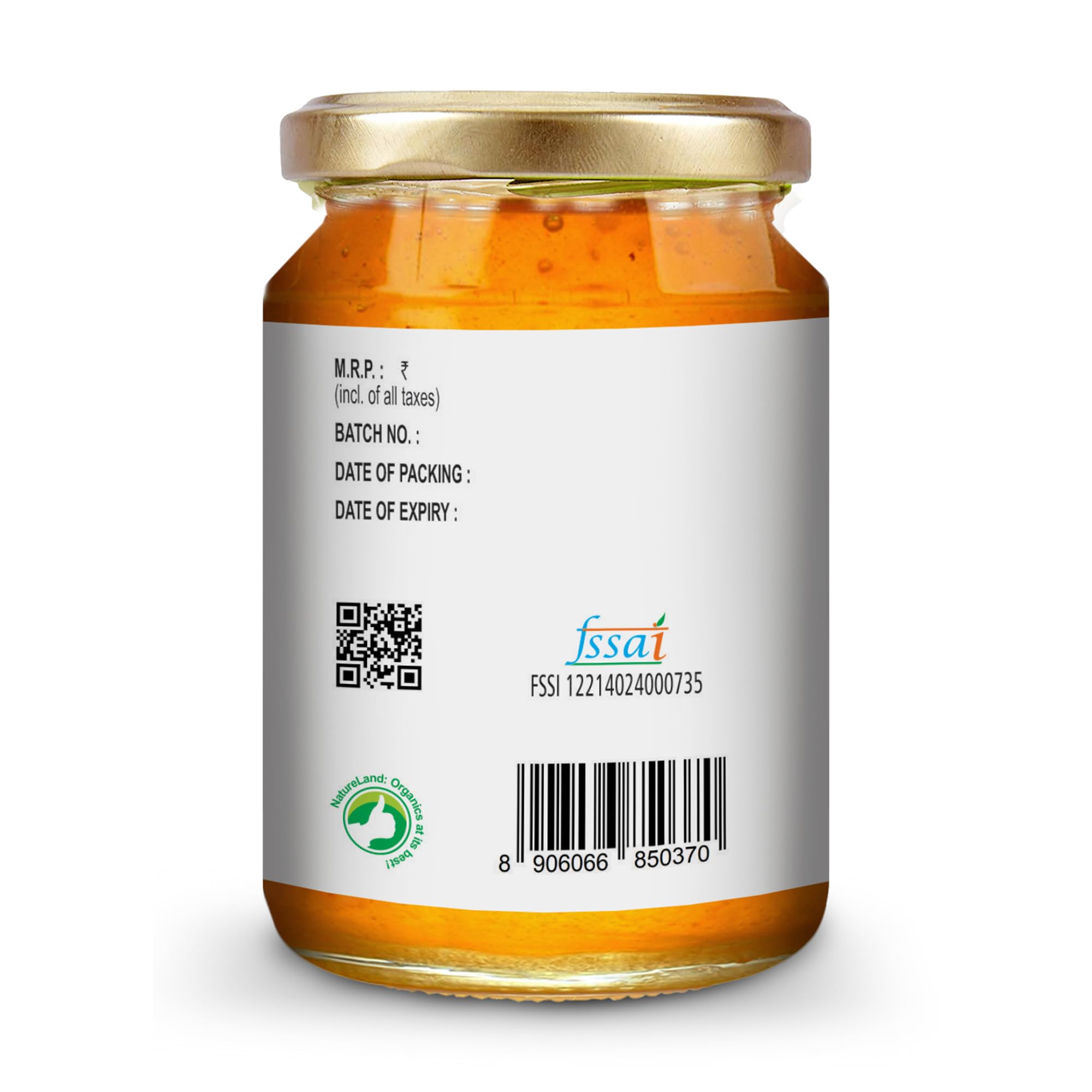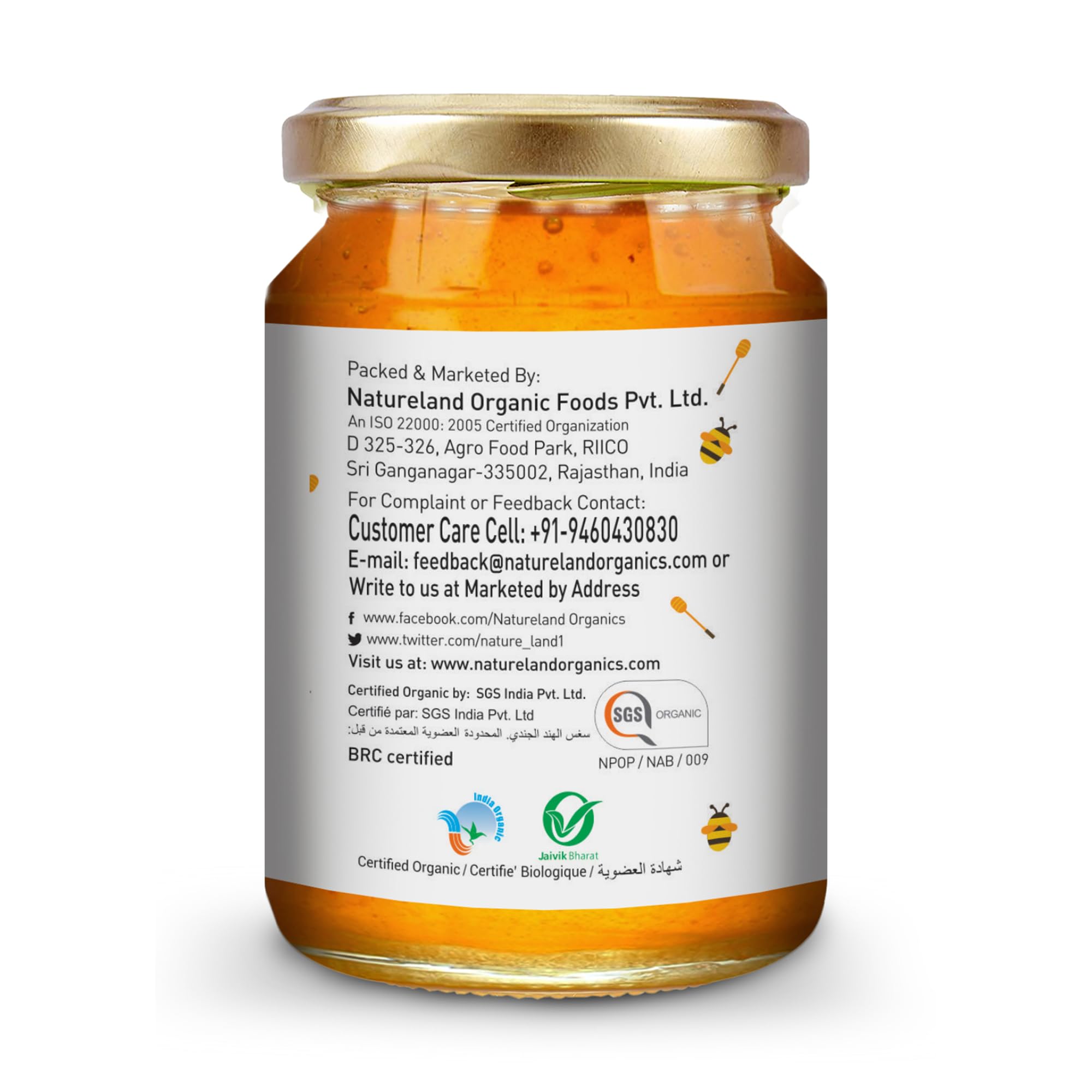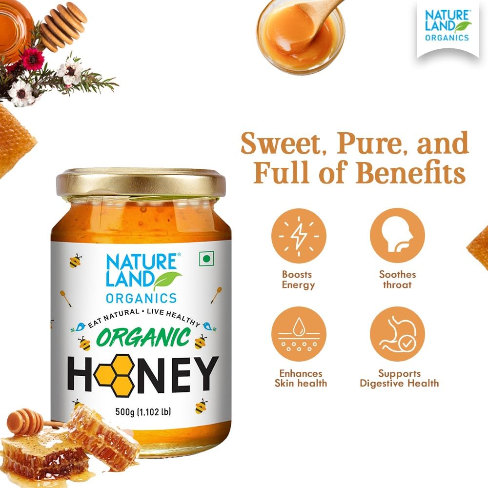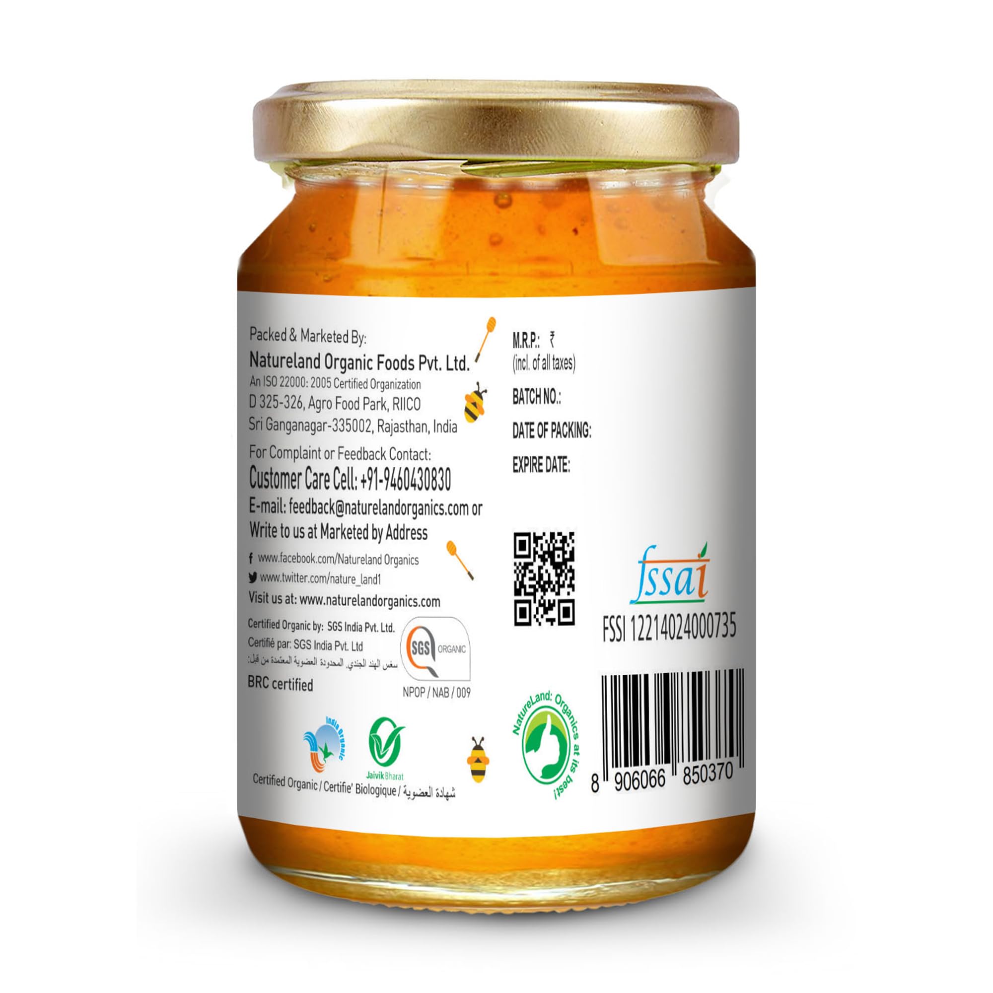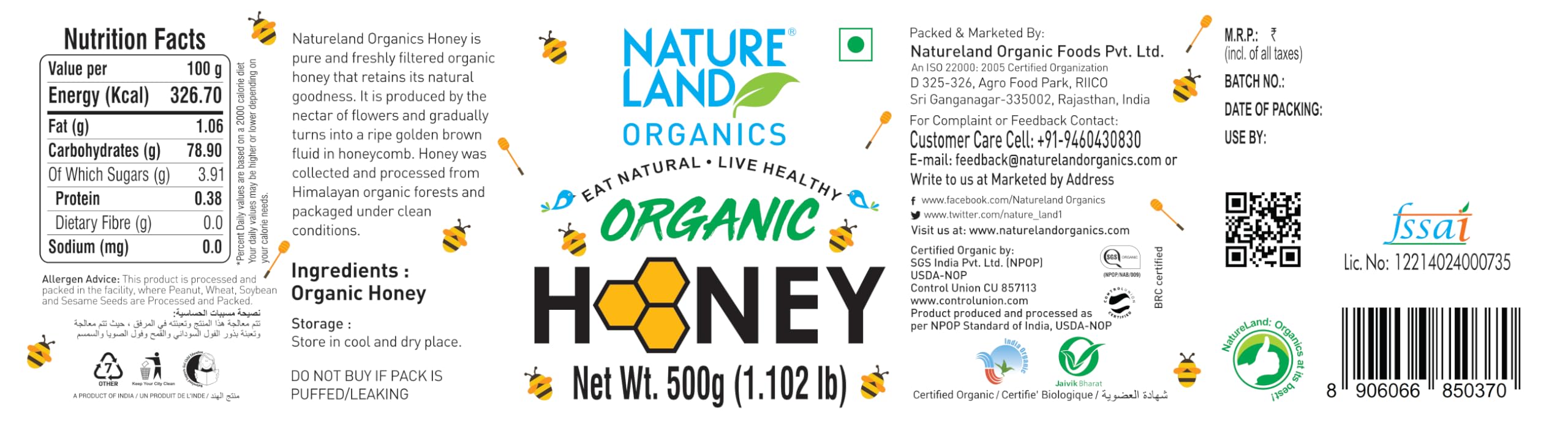 Natureland's organic multiflora nectar honey collected from Himalayan organic forests and processed and packed in hygienic conditions. In Hinduism honey (madhu) is one of the five elixirs of immortality (panchamrita). The Vedas and other ancient literature mention the use of honey as a great medicinal and health food a most assimilable carbohydrate compound and most effective aliment to generate heat create and replace energy and furthermore to form certain tissues. This honey besides supplies the organism with substances for the formation of enzymes and other biological ferments to promote oxidation. It has distinct germicidal properties. Maximum Shelf Life: 12 Months