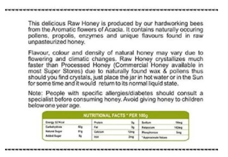 • 100% Pure Raw Honey- , Unprocessed, and Unheated. No added artificial flavor, No added sugars, No additives or colors.