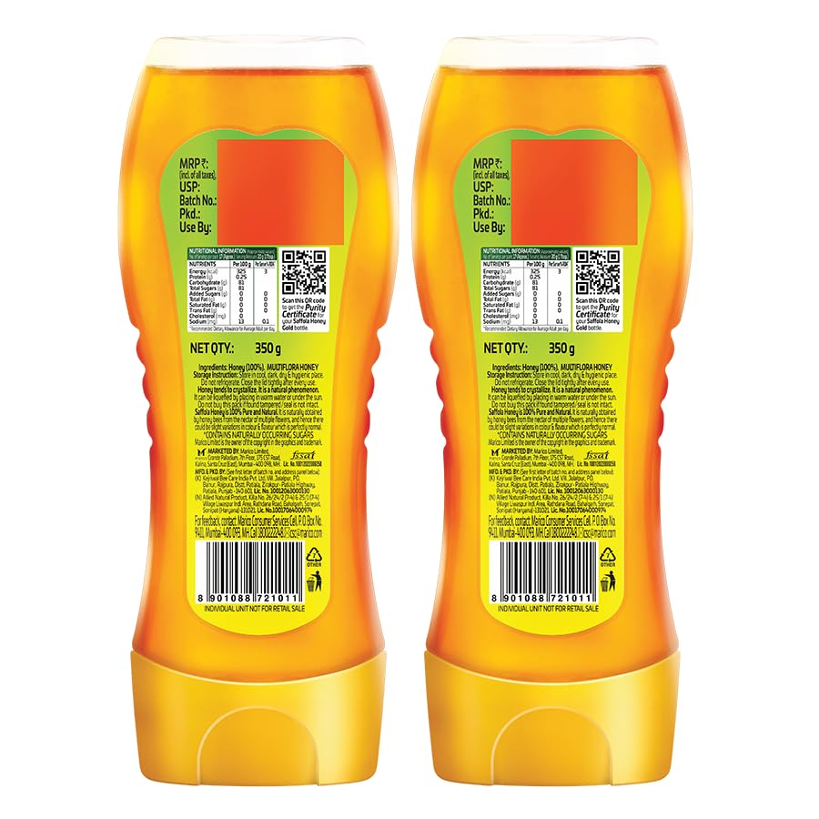 Honey is a natural food and comes with tons of uses and benefits and should be used in its pure form. Pure Honey is also a healthy alternative to sugar and is considered one of the most wonderful gifts that nature has ever gifted to mankind. However not all honey sold in the market are alike! Some are pure while others may be highly adulterated. As a consumer one needs to be watchful as adulterated honey comes with added glucose sugar syrup molasses corn syrup etc. Not every honey that reads pure necessarily stands true to its claim. A real sign of a pure honey is a product which is free from adulteration and which complies to all the FSSAI parameters. Saffola Honey Gold is natural honey in its purest form. It is multiflora Honey made using Kashmir Honey bringing the best quality to you. It is tested and approved after many rigorous quality checks. Each bottle of Saffola Pure Honey contains natural antioxidants has No Added Sugar and comes with a Purity certificate that is made available to its consumers.