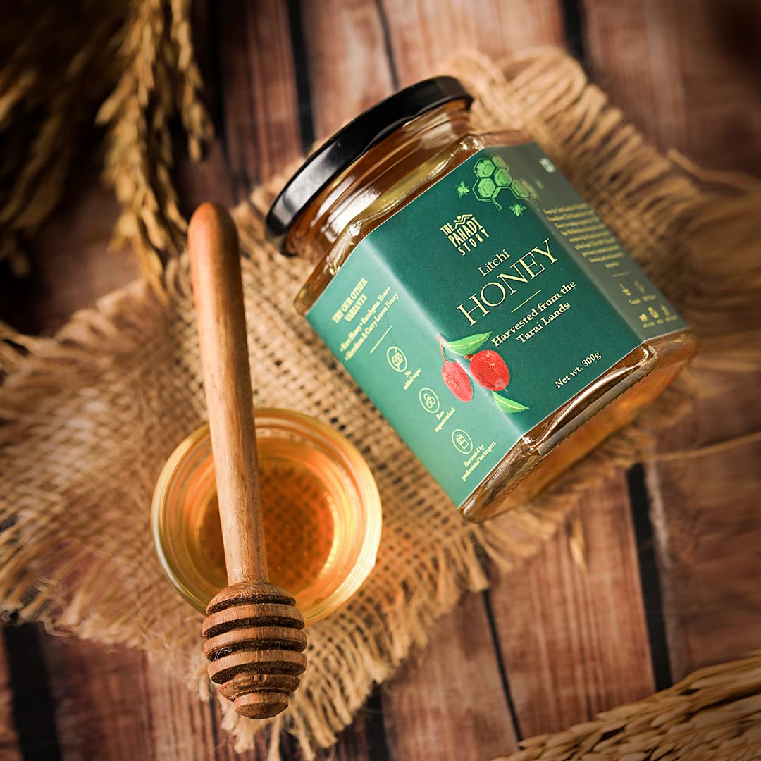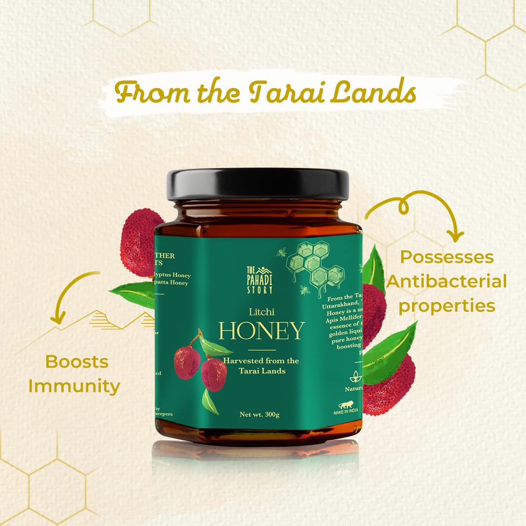 From the Tarai Lands of Nainital Uttarakhand The Pahadi Story Litchi Honey is a unique experience. The Apis Mellifera bees bring the sweet essence of the fleshy fruit to the golden liquid. This 100% Natural pure honey contains immunity boosting and anti-bacterial properties.