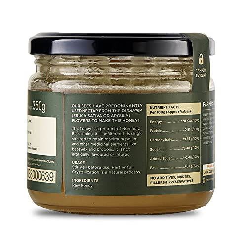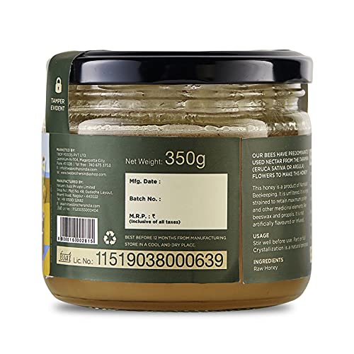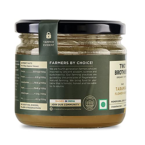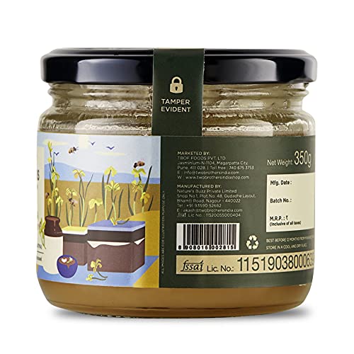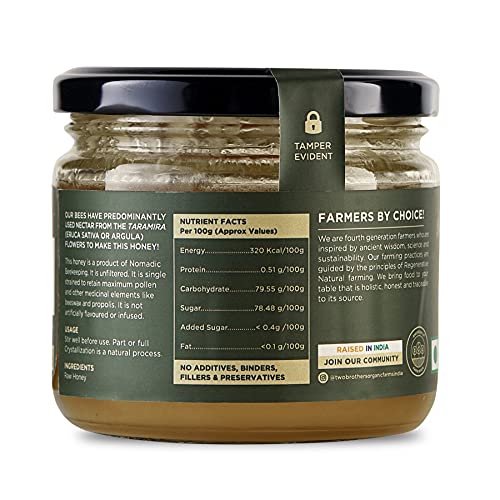 Honey is a Monofloral (Single Origin) Honey and the bees have a vast expanse of Jungle dense with trees Jungles that are carefully selected in regions that are far away from urban areas and extensive commercial farming.RAW HONEY: Bees collect pollen and nectar from flowers and store in the cells of the honeycomb.The Deposited Nectar has a content of about 25-30%.Nectar is converted into honey by enzymes and reducing moisture. Bees the moisture content of the nectar to 15-18% and hence Honey is formed and this honey is fully ripened honey.Bees then seal off the Beeswax (Fully Matured). Honey is then finally harvested after the above process if fully complete and ONLY Honey harvested after this natural process and not refined extensively is called RAW Honey.The straining process is done using age-old techniques which help retain the Pollen.CRYSTALLISED HONEY= HIGH QUALITY:This Honey is rich in enzymes and Pollen and will have a high tendency to crystallise.When honey crystallises it is still as nutritious and sweet as ever! The crystprove that your honey is high quality and hasnt been processed. It means that nutritious pollen has not been filtered out and necessary enzymes havent been damaged by pasteurisation.Two Brothers Organic Farms Honey is more likely to crystallise because we never heat our honey at high temperatures (or pasteurise it). Temperatures lower than 50 degrees Fahrenheit (10 degrees Celsius) can cause crystallisation. You might see white flecks in your honey too.This crystallisation even happens in the e in er temperatures.But for those of us who like to keep our honey slippery smooth fill a bowl with warm water (Not above 35 degrees celsius) and let your bottle rest until the crystdissipate.