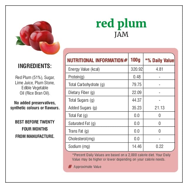 A jam is where the food cooks naturally to a puree before setting. Made from Fresh Plums from Himachal with a rich Red colour and its sweet and sour taste it makes a wonderful accompaniment to ice cream yoghurt with freshly made Dosas or even rolled into