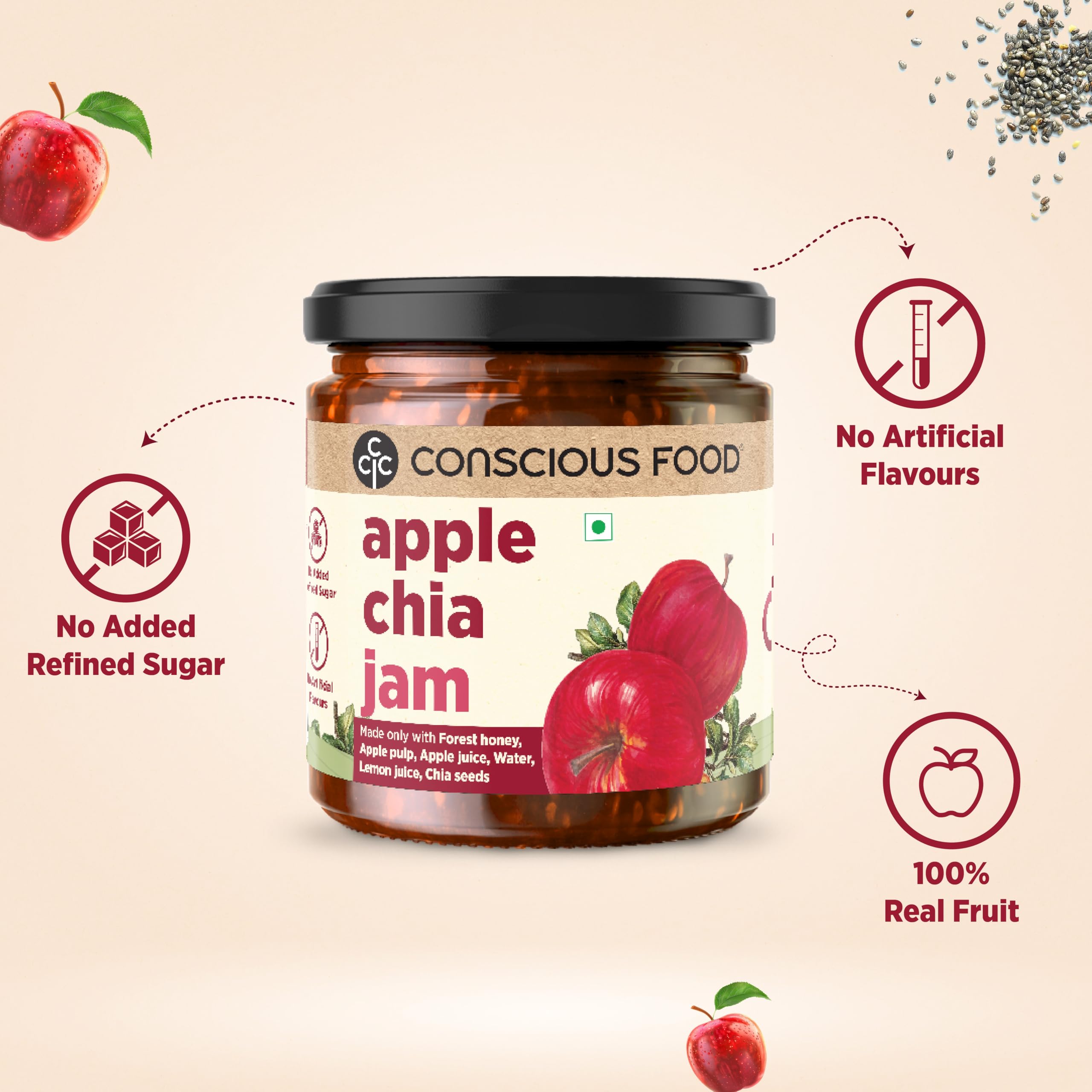 Wholesome cozy and cleanâour Apple Chia Jam is made with 45% real apple pulp chia seeds and zero added refined sugar. Itâs packed with flavor fiber and superfood goodness. No junkâjust juicy apples naturally sweetened and slow-cooked to perfection. Perfect on toast stirred into yogurt or as a topping for your smoothie bowl.