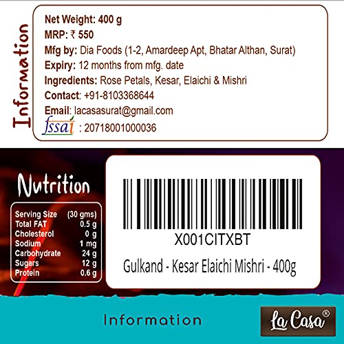 La Casa Pushkar Gulkand with Mishri Elaichi & Kesar | Homemade & Organic | 400g |