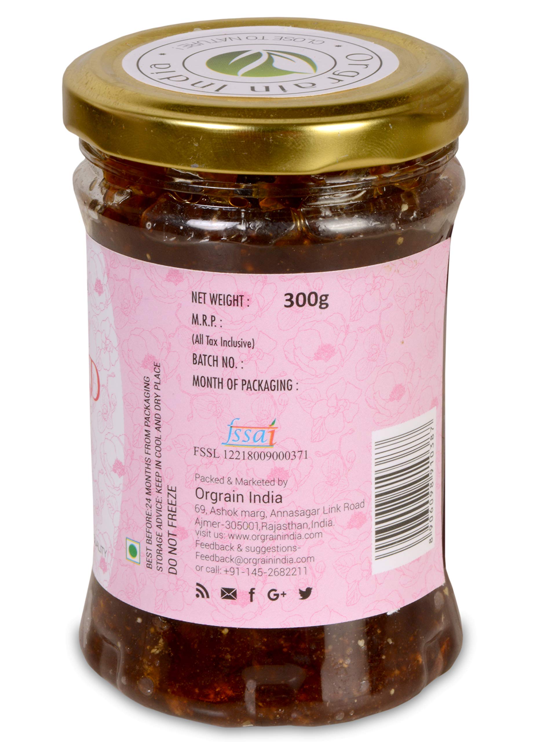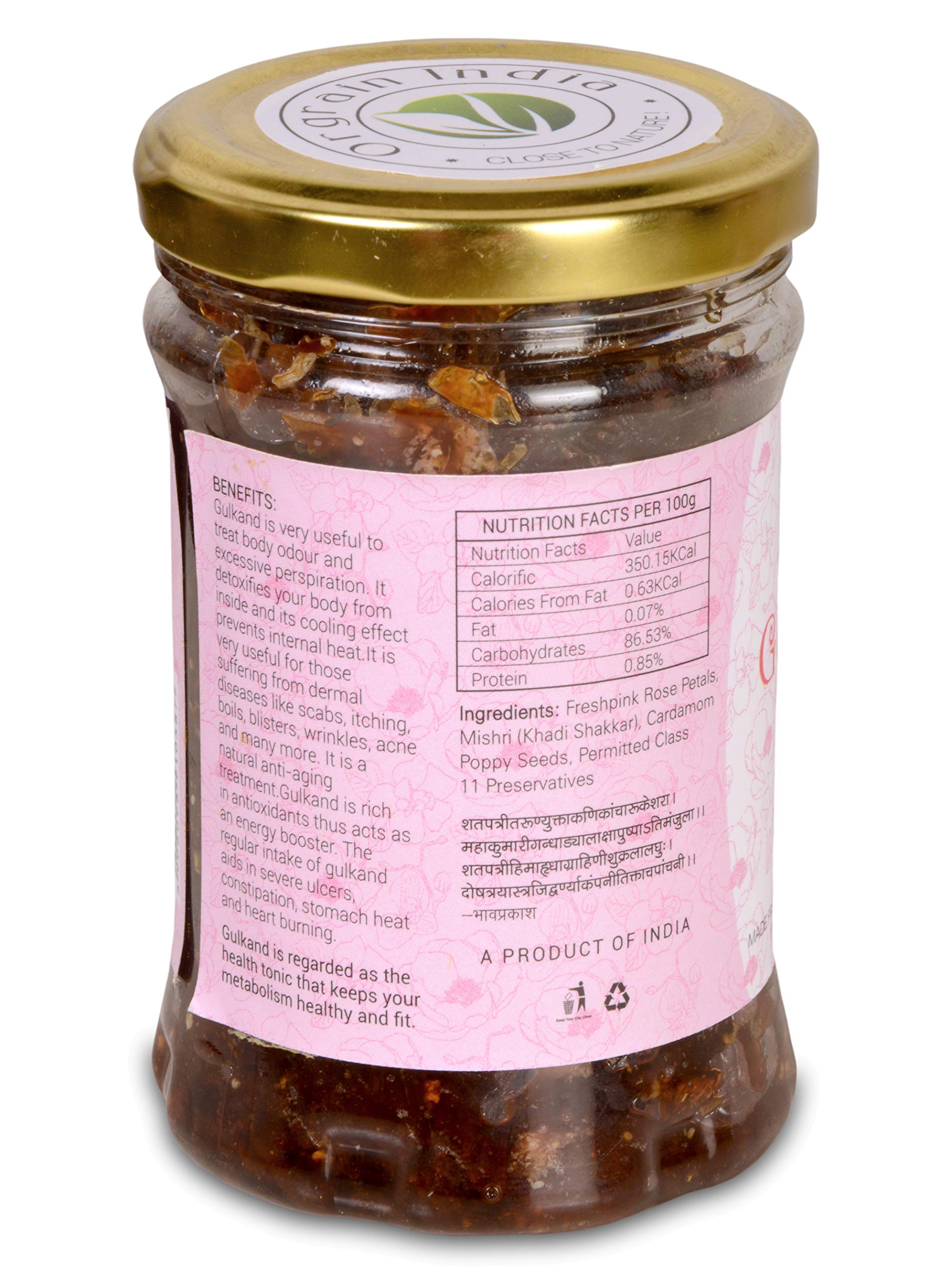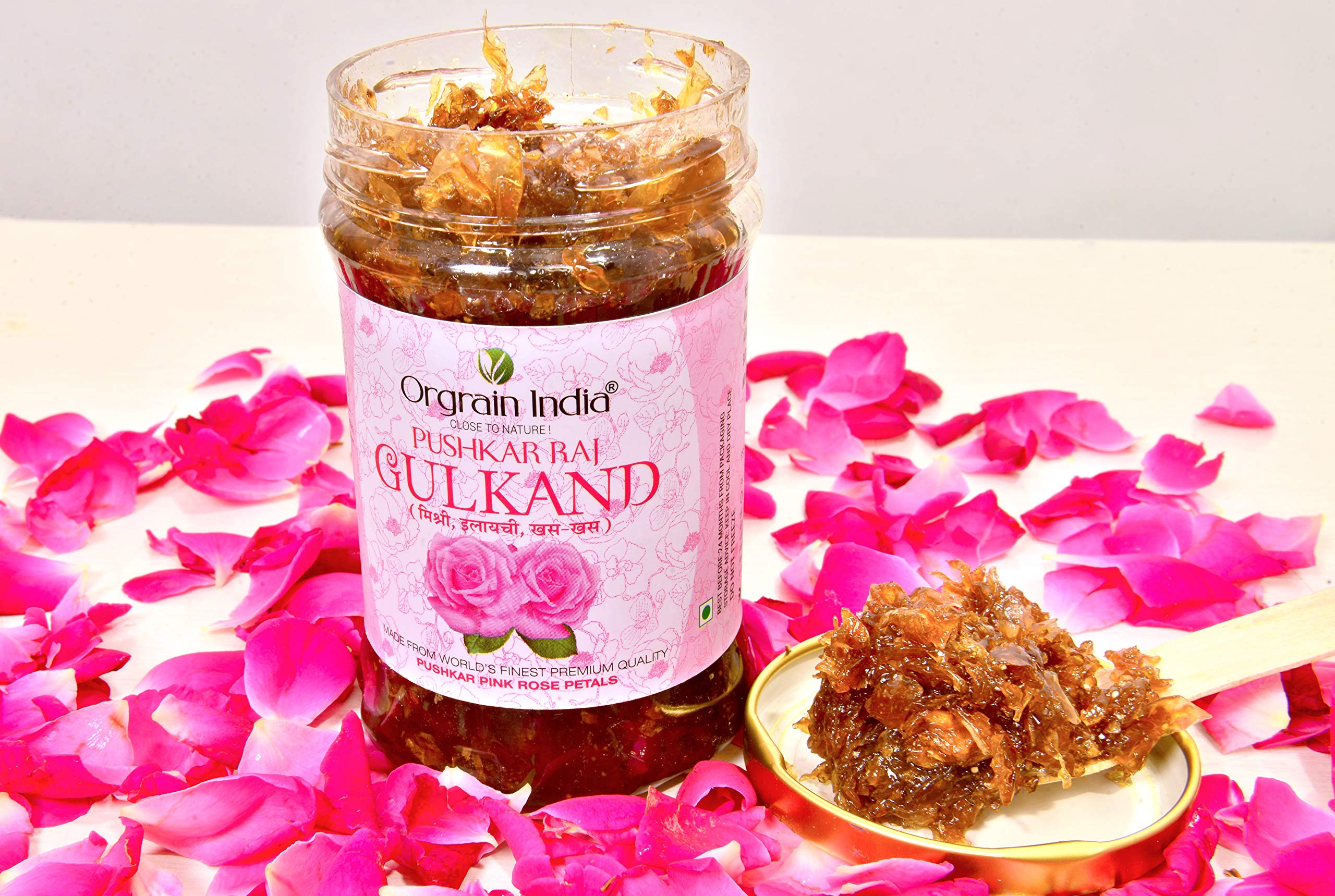Orgrain India Pushkar Raj Gulkand Made from Freshpink Rose Petals Mishri (Khadi Shakkar) Cardamom Poppy Seeds. 100% Natural: Does not contain any additives preservatives artificial colours artificial flavours and thickeners. Can be eaten straight from the