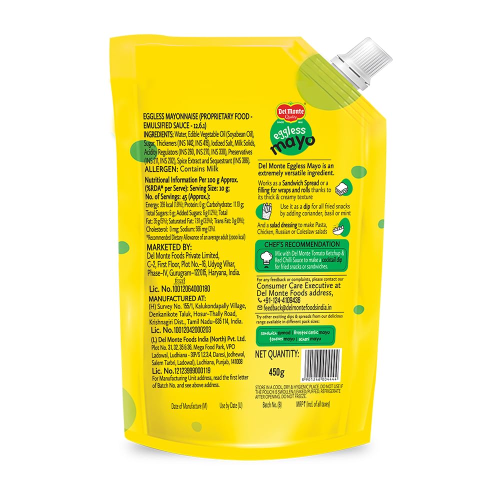 Del Monte Eggless Mayo Spout Pack 450 gm | 100% vegetarian | Thick and Creamy | Top Quality |Made by Chef Loved by all