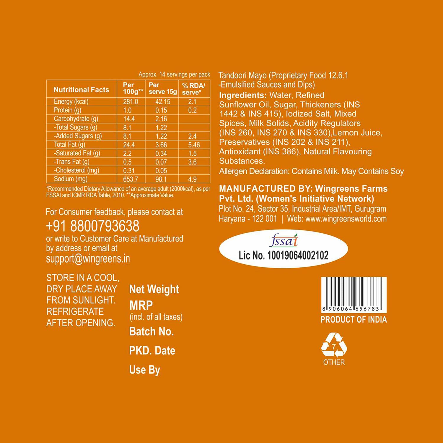 Our customer's favourite mayo comes straight out of a tandoor! The Wingreens Farms Tandoori mayo is a creamy smoky mayonnaise that lends a #tandooritadka to all your meals. Made with a premium quality sunflower oil blended to a smooth consistency with a range of tandoori spices and a hint of garam masala for that desi kick this mayo becomes a household favourite in no time! This desi fusion mayo works well as a dip a dressing or even a sauce. Use generously over parathas kebabs fried snacks sandwiches wraps and other dishes. This mayo was created in a kitchen as an experiment to celebrate our love for all things tandoori. And want you to do exactly that : experiment with its flavour - add it to pasta salad or soup! That classic Tandoori flavour is just a squeeze away. Go ahead give your dishes a #tandooritadka with our mayo