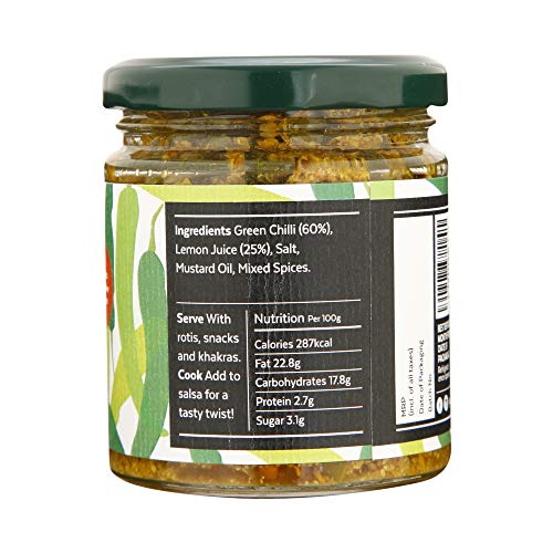Fresh green chilies tossed with mustard oil and spices. Sharp and classic! Aamra's pickles follow traditional recipes and time-honoured techniques. Preserved naturally in special spice blends our pickles are aged in barnis (earthen jars) that are stored in cool dark rooms to draw out the natural flavours. Pickles that will add a punch to every meal Aamra's pickles are easy to store and convenient to use. Serve with all Indian meals or as a refreshing side with grilled meat dishes.Ideal with Indian meals rice and lentils and parathas for the perfect breakfast! Aamra's products are 100% handmade by the women of Nari Shiksha Kendra. No artificial preservatives Gluten Free. Preserved traditionally in earthen jars or 'barnis'.