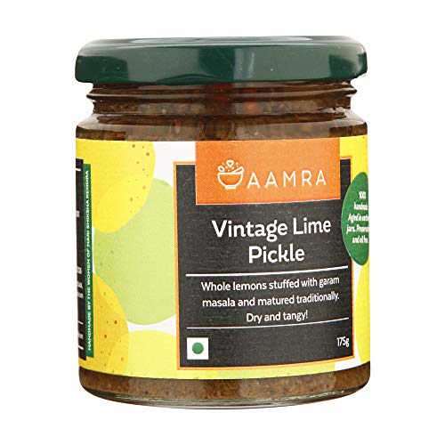 Aamra traditional vintage lime pickle 175gm (black lemon pickle). dry & tangy | whole lemons stuffed with garam masala ajwain (carom seeds) and black pepper and matured traditionally in earthen jars. Oil free preserved in barnis (earthen jars) no artificial preservatives handmade serve with all Indian meals add to stews & tagines - great for tiffin or as a post-meal digestive!.