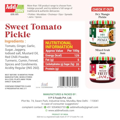 Tomato, Ginger, Garlic, Sugar, Jaggery, Iodised Salt, Mustard oil, Red Chilli Powder, Turmeric, Cumin, Fennel, Spices & Condiments