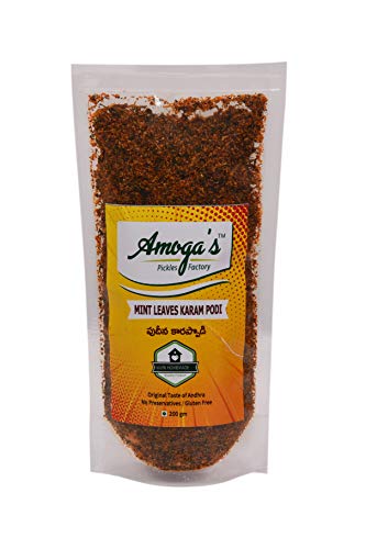 Amoga's present Andhra's Mango Thokku Pickle available in mini pack. Eat Healthy Live Healthy and Mint leaves karam Podi is a calming and soothing herb that has been used for thousands of years to aid with upset stomach or indigestion.This nutritious extremely delicious Mint Karam powder makes a great accompaniment for idli/dosa/roti/sandwich /Khakra or rice.This is another unique and essential delicacy from Andhraâs culinary tradition.