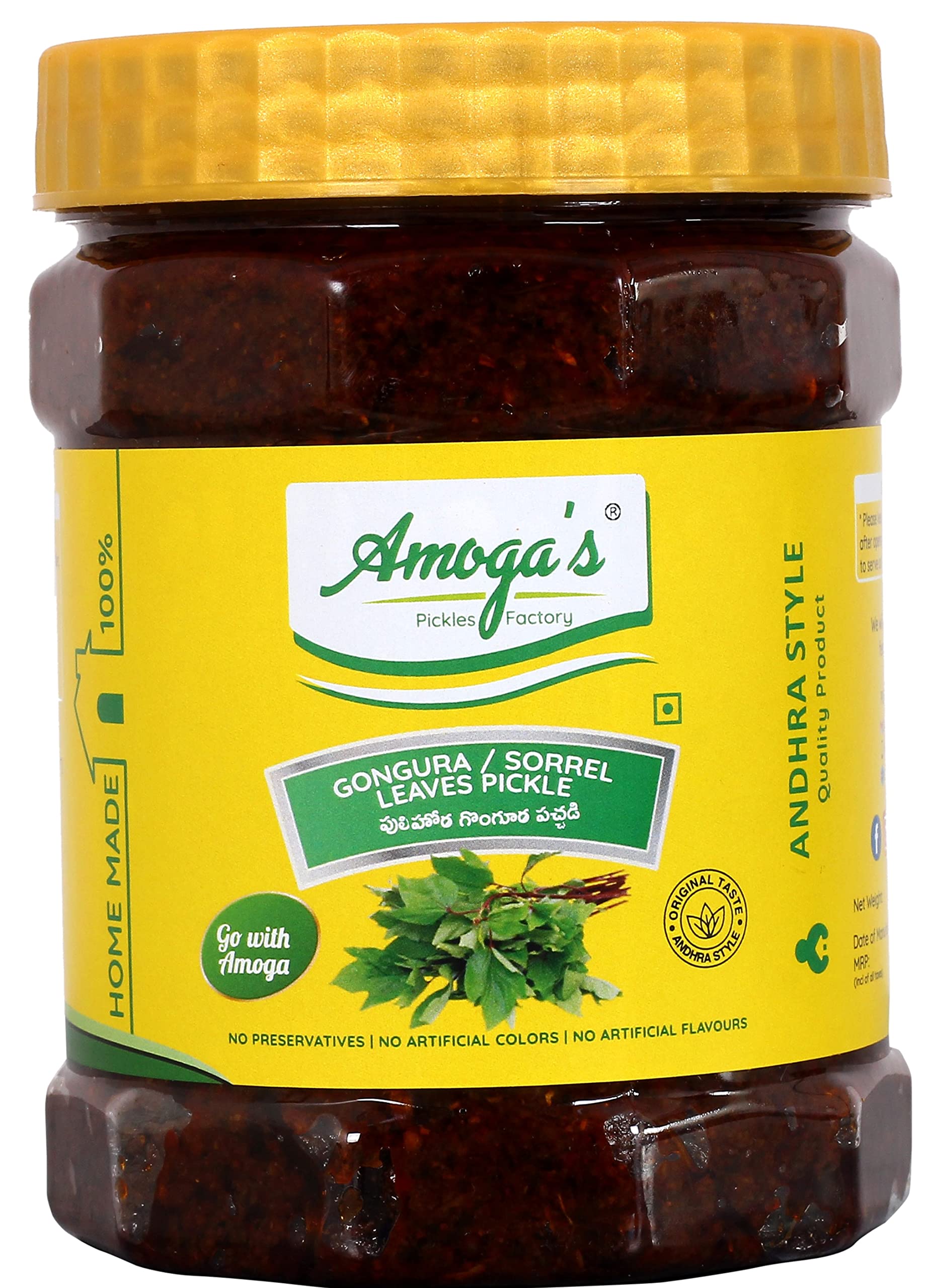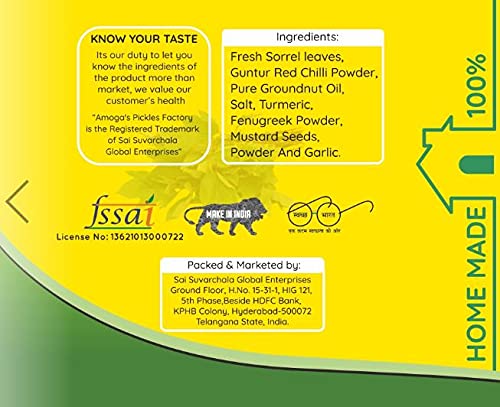 Amoga's Pickles Factory Andhra Authentic Pulihora Gongura Pickle 100% Natural Handmade 1000gmPack of 2 (500gm Each)