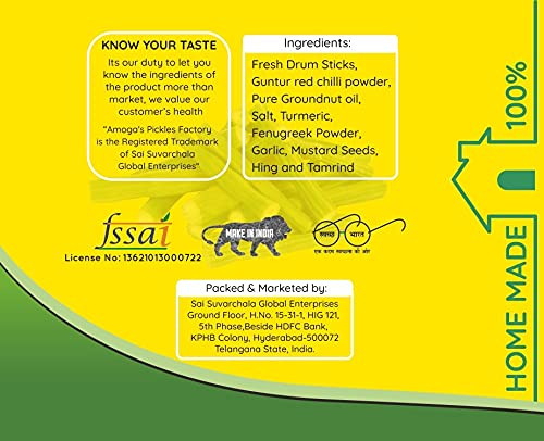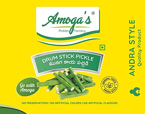 A very different and unusual pickle from the kitchens of south india the Drumstick pickle is perfectly spiced and 100% sure to tickle your taste buds.Amoga's Pickles Factory brings to the unique taste of Drumstick pickle.Drumsticks have anti-inflammatory properties and generous amounts of vitamin C.Drumstick is also known by several vernacular names such as shevaga in Marathi shajan in Hindi murungai in Tamil muringnga in Malayalam and munagakaya in Telugu. Drumstick pods and leaves are a storehouse of essential nutrients.Drumstick is praised as a tree of life as almost all the parts of the tree are beneficial and used for various purposes