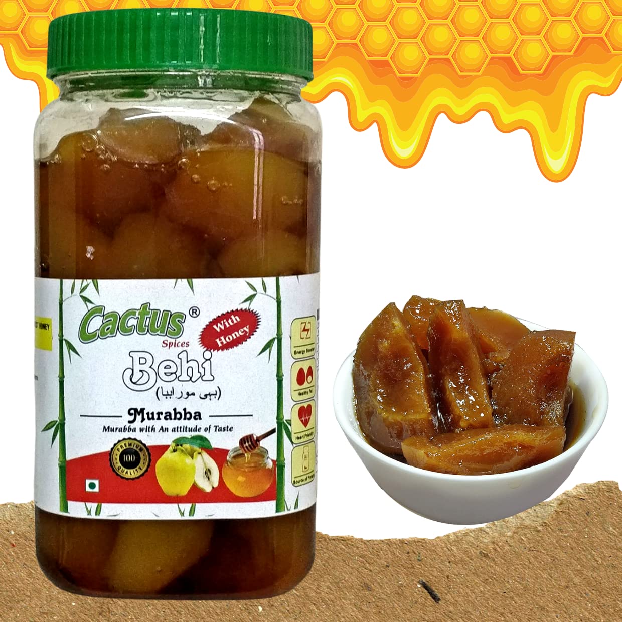 Behi is fruit of Paradise also called as Quince(Safarjal). It has been made by using finest quality Quince fruits and natural row forest honey. Row Forest Honey Natures delicious secret to good health Honey is 100% pure and natural and effective in lowering high blood pressure treating diabetes skin problems dental diseases infected throat and allergies.