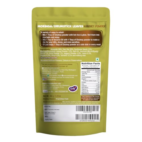 100% Clean Ingredients: Made from moringa leaves lentils and traditional Indian spices this chutney powder is free from MSG Maltodextrin and has zero junk. Traditional Delicacy: South Indian Chutney Powder or Gunpowder recipe that is relished with dosas idlis hot rice and even parathas. How to Use: Just mix 1-2 Tbs of Idli Chutney Podi with hot sesame oil or ghee. Enjoy this Molaga Podi with hot Idlis Dosa or Rice. Nutrient Dense: Moringa leaves chutney podi or drumstick leaves are very high in Calcium & Iron. An excellent nutrient for kids growth & weight gain. Freshly Made: We make it fresh everyday in small batches avoiding the need to add preservatives or stabilizers. We keep it 100% Junk Free!