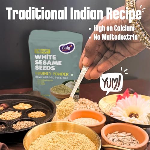 Sesame Seeds Chutney Powder 150 gms. Pack of 2. Freshly handmade Sesame Seeds chutney powder for all Rich in Calcium. Fabulously delicious meal time Just 2 Servings of Chutney Powder has Calcium equivalent to a glass of milk (100 ml) Ingredients include sesame seeds 44% sunflower seeds 44% curry leaves red chilli powderwood pressed coconut oil rock salt hing and nothing else No Preservatives or Artificial Flavours. Shelf life: 2 Months Why Moms love Early Foods: Made from ancient Indian Super Foods We make really small batches of food each day. So you can always feed super fresh meals. Grandma inspired recipes simple healthy with minimal processing No Preservatives colors or artificial flavors. All Natural