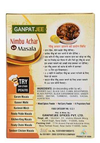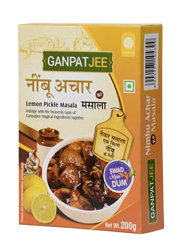 About GanpatjeeGanpatjee believes in superior quality products with the best quality ingredients packed with due care Lemon Pickle Masala200 gmGanpatjee Lemon Pickle Masala is distinctively prepared to enhance the traditional Indian taste of lemon pickle (Nimbu achaar) keep it in a cool and dry place. To keep the contents fresh and retain maximum flavour once opened transfer the contents in an airtight container or keep the contents tied and packet closed. This masala can be used to flavour various curries and starters. A wonderful way to make every meal richer and tastier. We use no chemicals or preservatives. Our most loved lemon pickle masala in India is popularly known as lunchbox achaar as kids and adults love to carry it in their lunchbox and also while travelling since there is no risk of leakage. This will taste great when you eat it with other dishes. It is a blend of natural spices and salts to make a perfect mix of acharProduct Specifications:Product: Lemon Pickle MasalaQuantity: 200 GramIngredients: Salt White Black Salt Cumin Ajwain Black Pepper Black Cardamom Seed Ginger Cloves Cinnamon AsafoetidaProduct FeaturesServe it in Indian meals like Daals Cheela Pakodi Poha and ParanthasVegetarian Product! No Artificial colours and No additivesPackage Includes:Lemon Pickle Masala 200 Gram