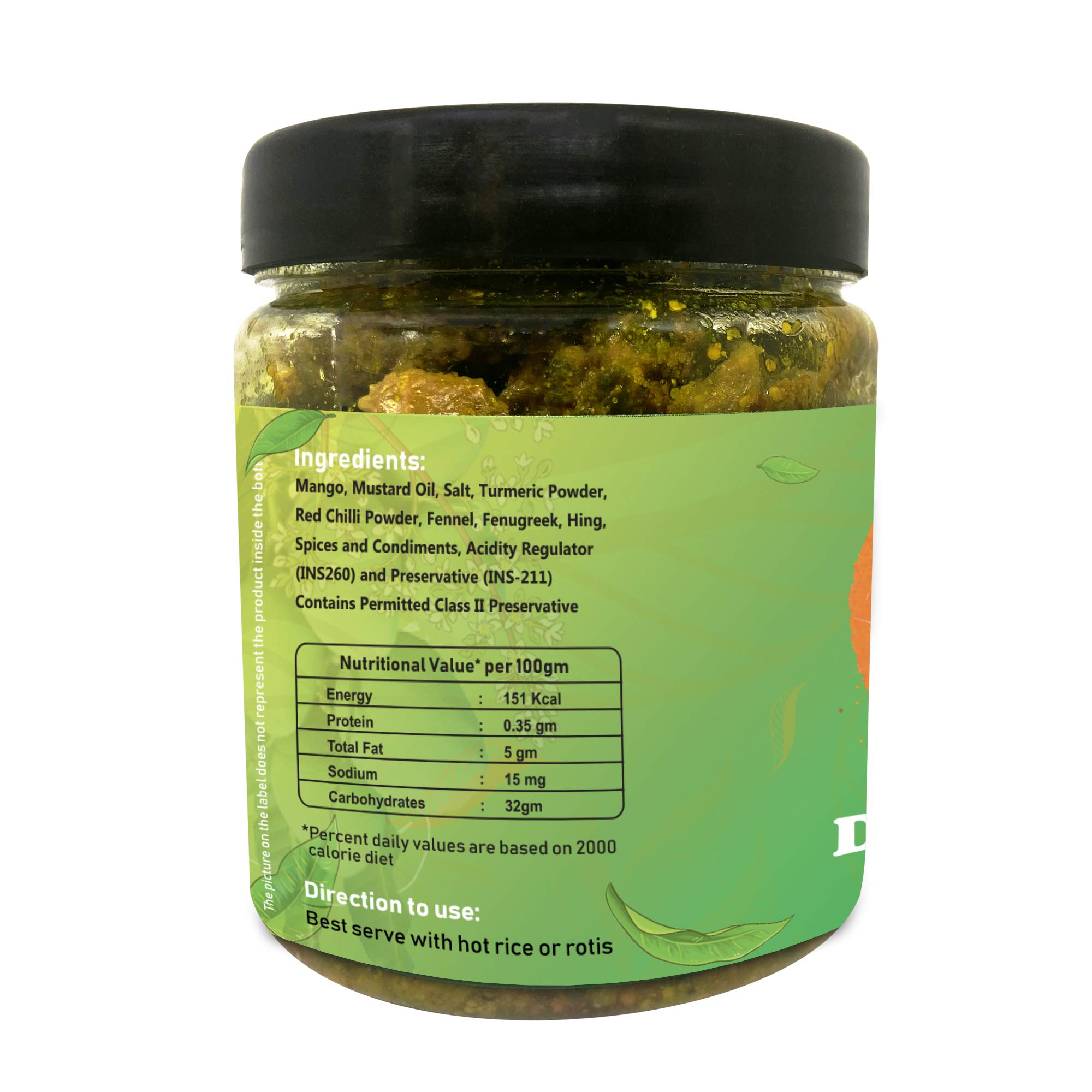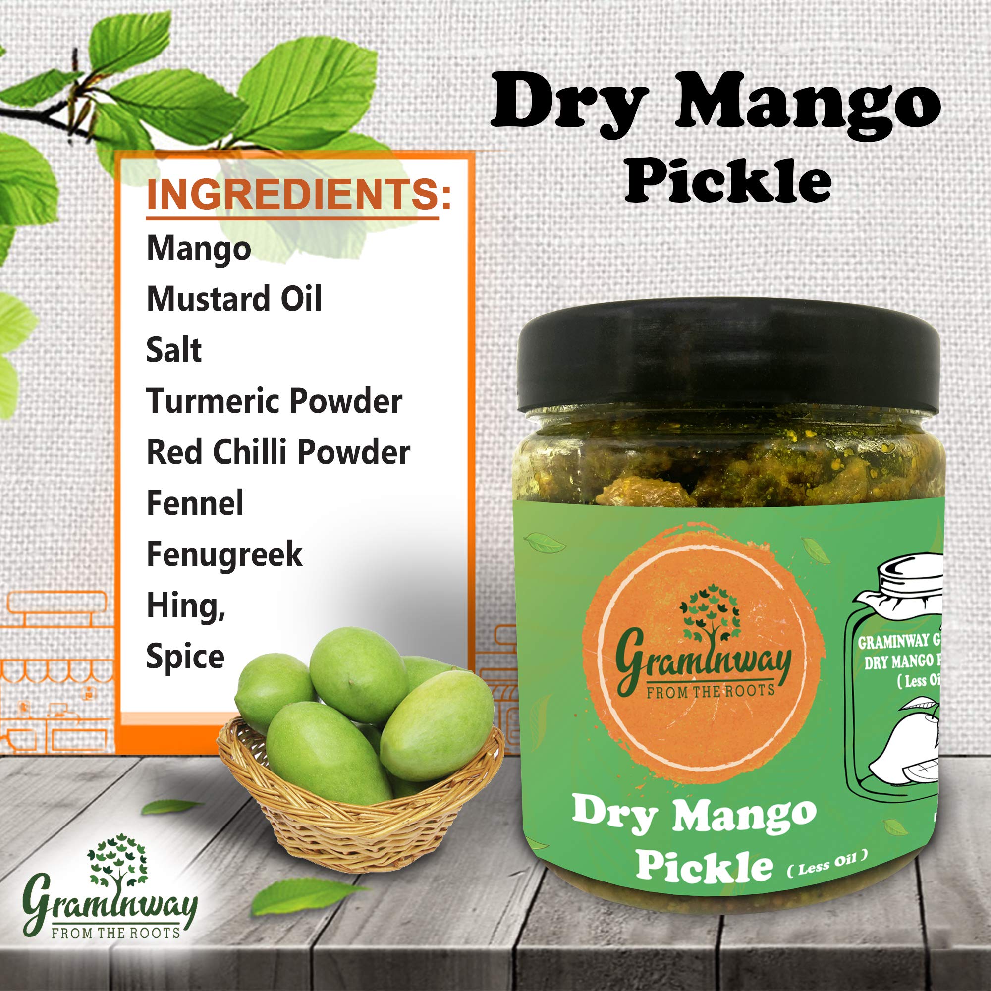 Mangoes are the one fruit that everyone loves unanimously. Whether its the succulent sweetness in ripe mangoes or the sharp tang of the raw green ones mangoes are a must-have. Mangoes are rich in Vitamins A and C and are said to boost immunity control cholesterol levels and promote digestion. Graminways Dry Mango Pickle is made from mangoes handpicked from a farm in Meerut where the farmer lovingly tends to every one of his crops sans chemicals and he ensures that all their goodness is well-preserved. We then trim cut and mix the mangoes with just a few drops of cold-pressed mustard oil and the freshest of spices. We then stir it well and bottle up this goodness for you to enjoy with your chosen meal of the day!