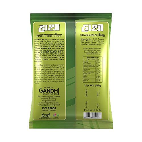 Hathi presents this achar masala which is made of chili powder iodized salt mustard seeds edible oil fenugreek seeds turmeric powder and asafetida powder and best before 8 months from the manufacturing date.