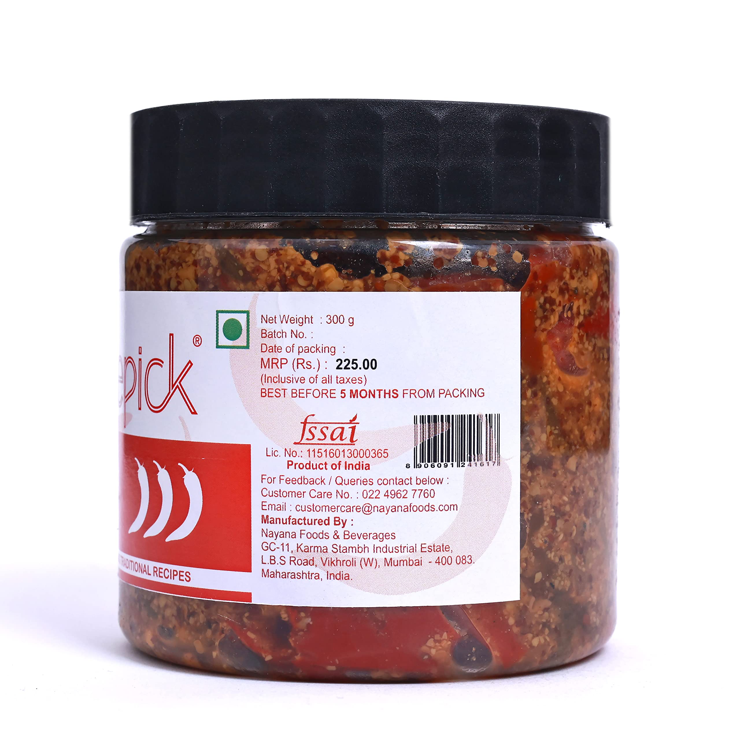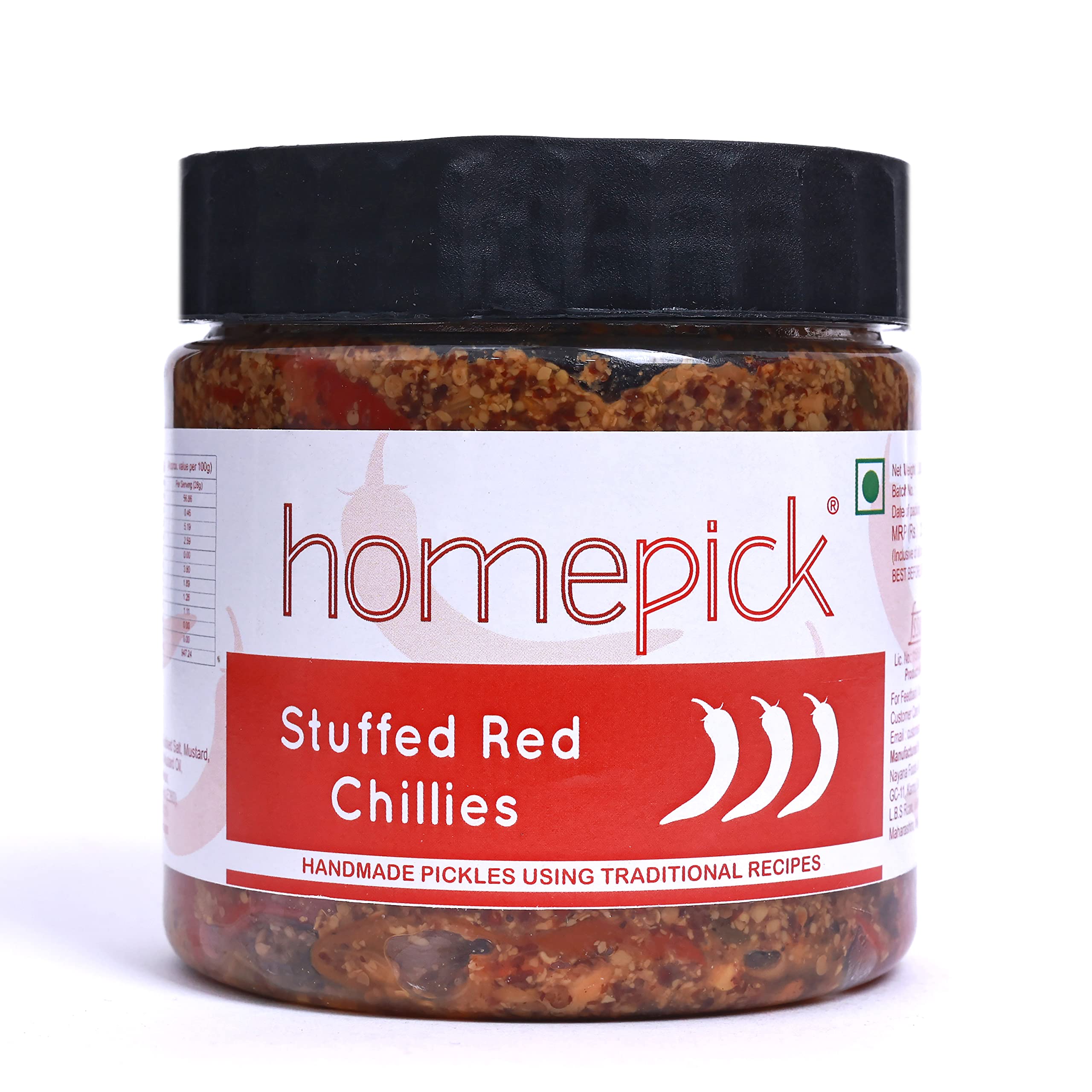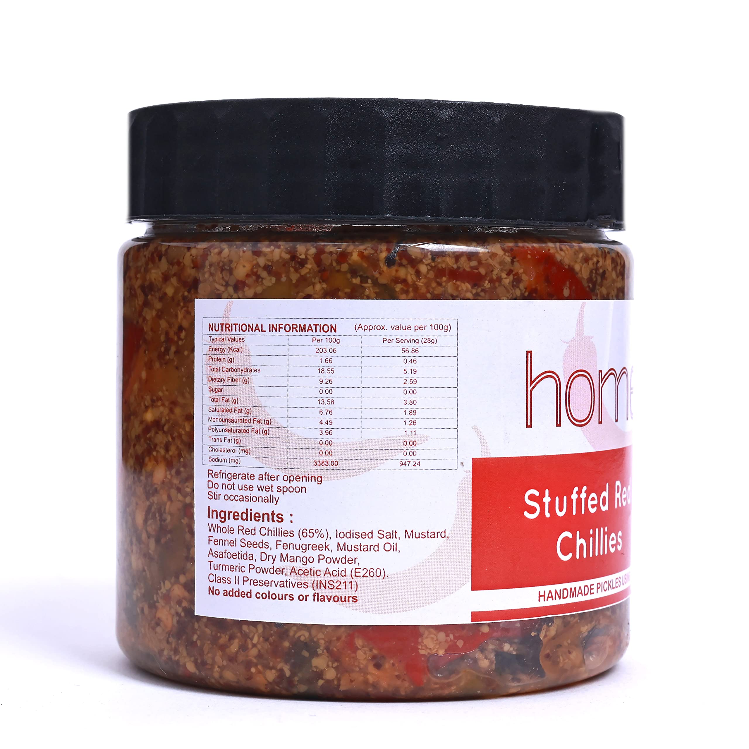 Our Stuffed Red chilli pickle is made using whole long red chillis sourced from Rajasthan. Theses chillis are mild spicy in nature and we pickle them using a traditional marwadi recipe which costitutes a blend of Indian spices like mustard fenugreek dry mango powder salt and very little oil. Compliments every traditional Indian dish. All our pickles are handmade using the most pure and premium quality ingredients be it mangoes, lemons, chillis, oil or spices. We make over thirty different varieties of pickles which range from the conventional to the most unique varieties of pickles consisting of sweet to sour to spicy to tangy recipes catering to each and every palate. Our variants include several regional specialties of India like the Gujarati Chhundo and Gol Keri, Rajasthani Ker Sangri, Andhras Avakkai Mango, Maharashtrian Thecha, Kolkatta Pickle and many others.