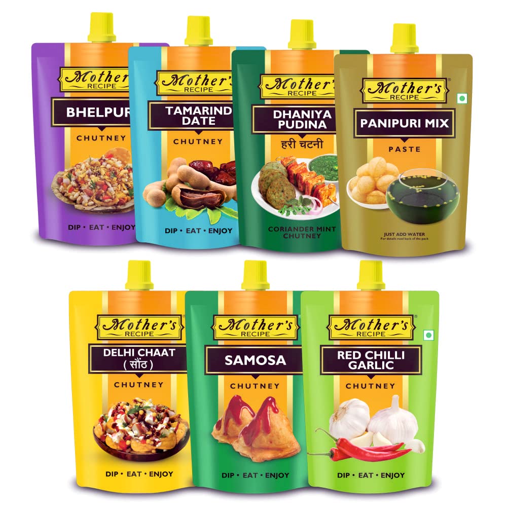 Delhi Chaat ChutneyPour this chutney over your homemade chat and bring the authentic taste of Delhi street side chaat to your table.Samosa ChutneyEnjoy hot samosas in the comfort of your home with our tangy samosa chutneyBhelpuri ChutneyMake your home made bhelpuri more delightful by seasoning it with our tangy bhelpuri chutney.Tamarind Date ChutneySavour your favourite snacks with the tang of tamarind and sweetness of date with our tamarind date chutney.Red chilli Garlic ChutneyAdd that zing to your everyday snacks with this delectable mix of our red chilli garlic chutney.Panipuri Mix PasteTreat your family with Homemade Panipuri made with our spicy and tangy Panipuri mix and fulfil your chatpatta cravings. Direction To Use: Mix 4 tbsp (50g) of Mother's Recipe Panipuri Mix paste in 450 ml of chilled water. Dunk the Puris filled with mashed Potatoes and Sprouts or soaked Boondi in the prepared water and enjoy. Taste best with our Tamarind Date Chutney.Dhaniya PudinaElevate the taste of your sandwiches pakoras tikkis and kebab with flavourful and zingy all time favourite the Dhaniya Pudina chutney.