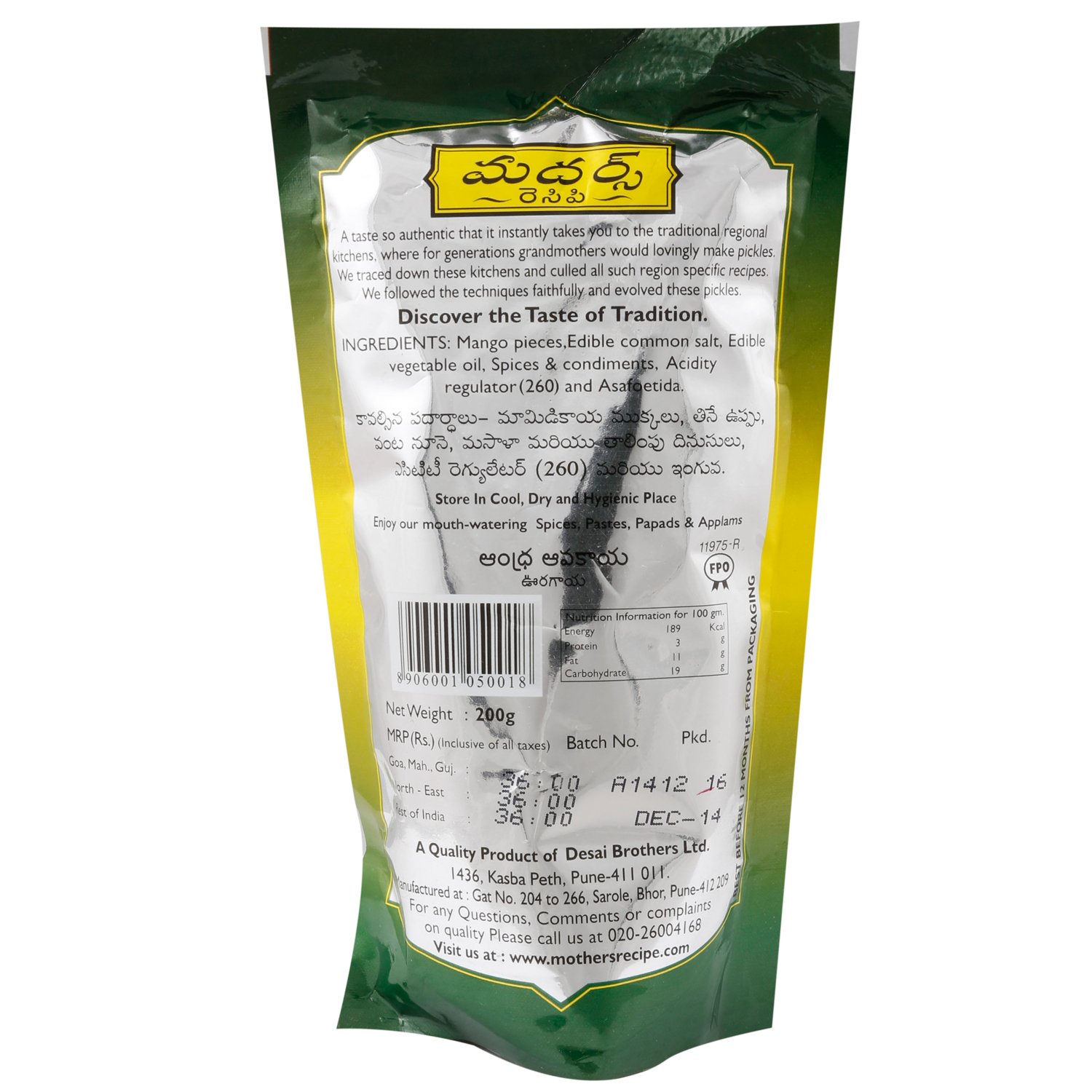 Mother's RECIPE Pickle-Andra Avakaya,200G Pouch