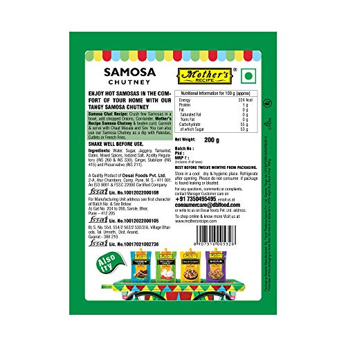 Enjoy hot samosas in the comfort of your home with our tangy samosa chutney. Crush few samosas in a bowl add chopped onions corriander mother's recipe samosa chutney & beaten curd. Garnish & serve with chat masala and sev. You can also use our samosa chutney as a dip with pakodas cutlets or French fries.