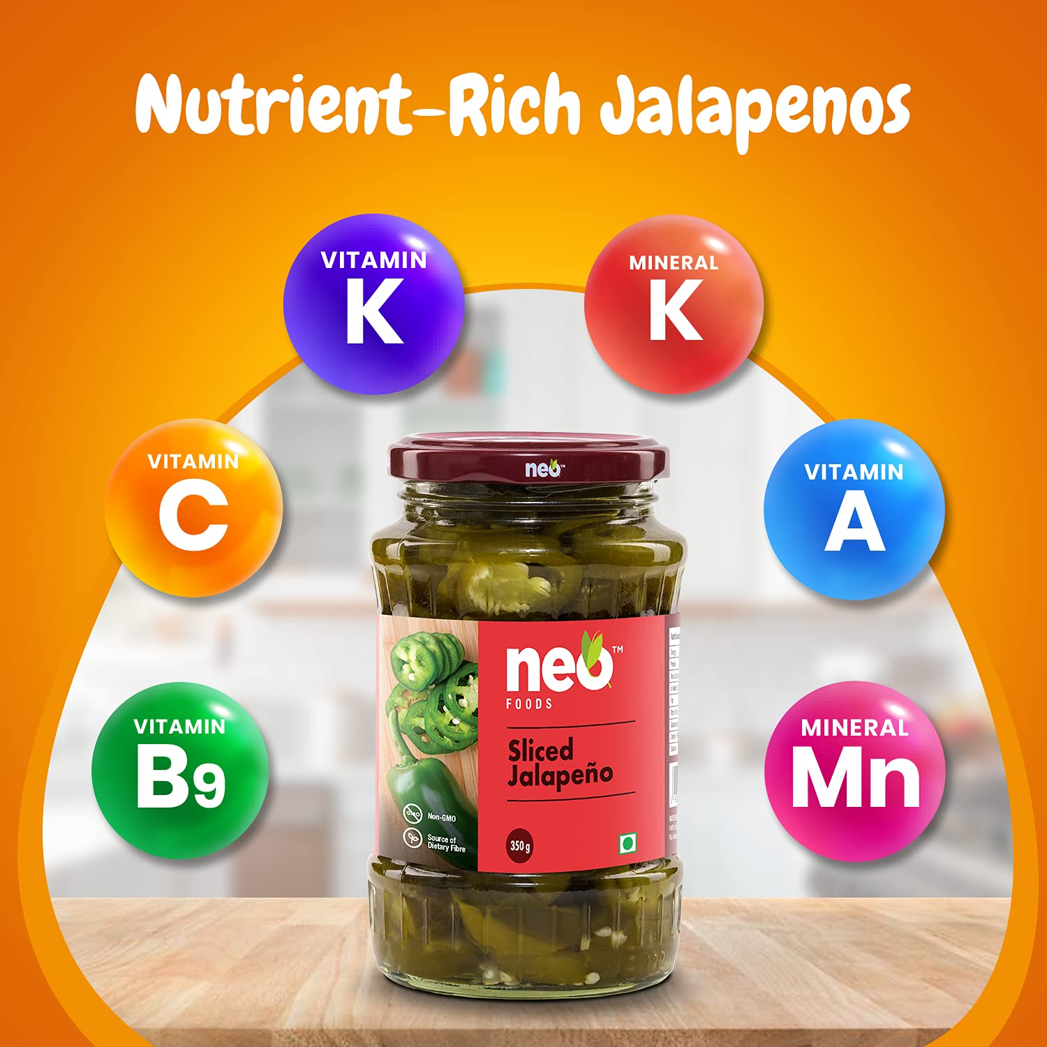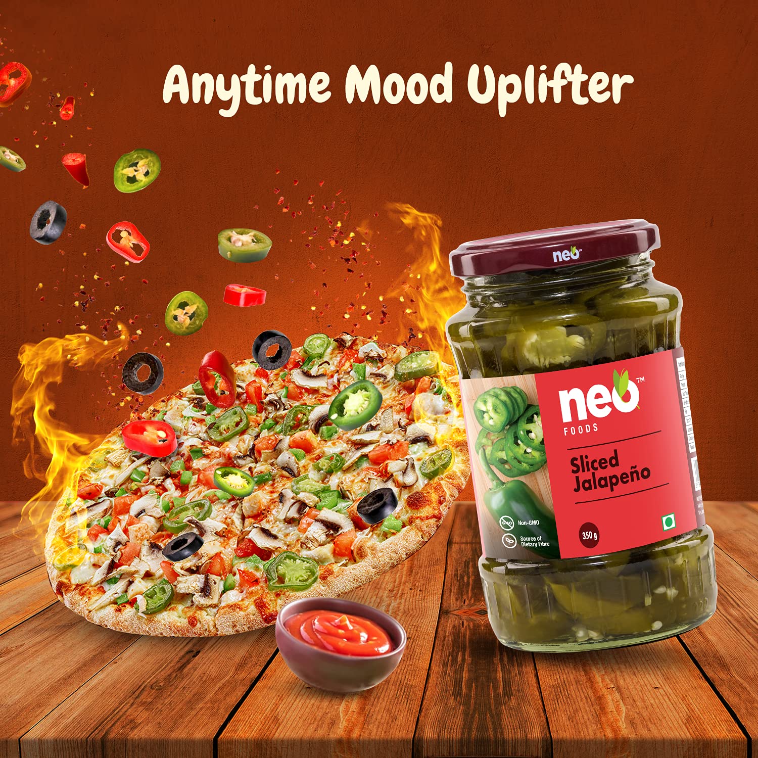Neo Sliced Jalapenos 350g I Ready-to-Eat Fibre-Rich l Pickled Jalapenos l Enjoy as topping for Pizza Pasta Salads Burger & Wraps l Non-GMO 100% Vegan (Pack of 1)