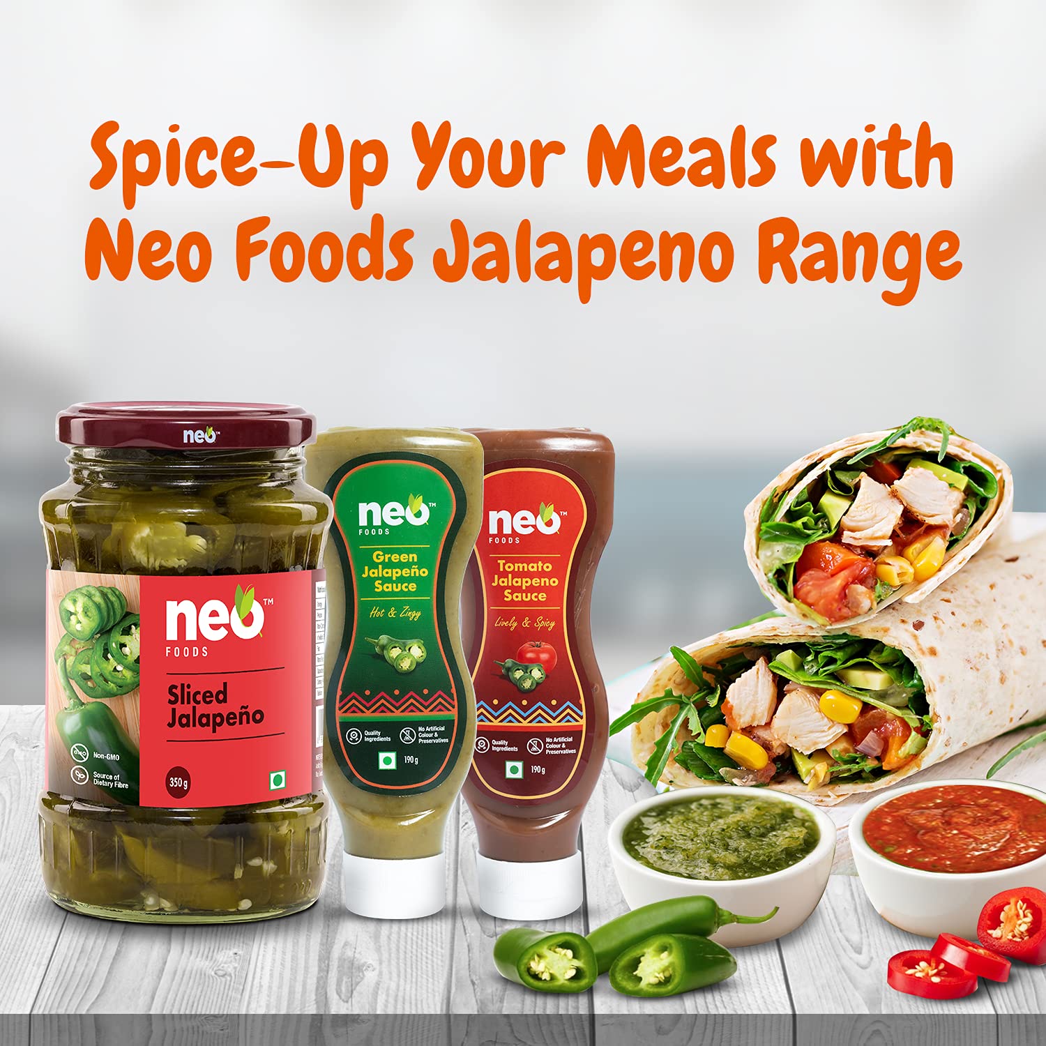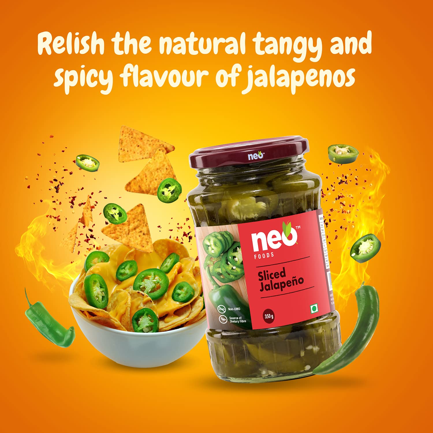 HomeGroceryFlavorsHomemade PicklesNeo Sliced Jalapenos 350g I Ready-to-Eat Fibre-Rich l Pickled Jalapenos l Enjoy as topping for Pizza Pasta Salads Burger & Wraps l Non-GMO 100% Vegan (Pack of 1)