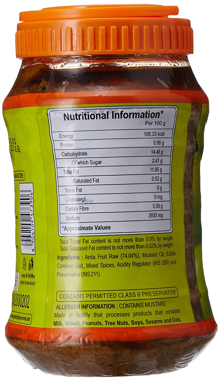 Pickle from Patanjali is another additional good thing since it is a brand that offers products typically based on the principles of Ayurveda. Rich In Vit C It helps to drop down the blood sugar level by Facilitates the proper absorption of insulin.It increases the body's immune system and prevent from common cough and cold.Help full in hair fall control.long shelf-life because of high mustard oil content (10-12)% meanwhile other products in the market have only 3- 4 % of oil.Mango,lime,Mustard oil,Carrot,Edible Common Salt,Green Chilli,Mixed Spices((fennel, yellow mustard, red chilli powder, cumin powder, fenugreek seed powder, coriander powder, kalonji, cinnamon powder, asafoedita, cardamom powder),Ginger,lotus Stem,Dela and Preservatives.