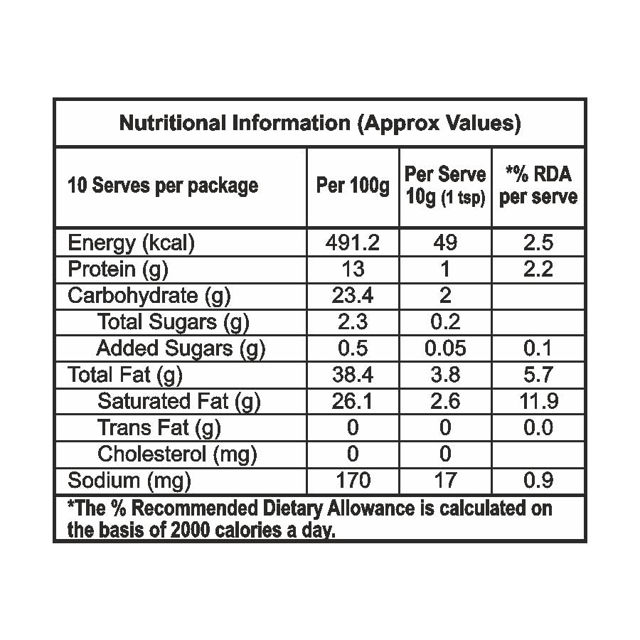 Ingredients: Flax Seed (61%) Coconut Sasame Lodized Salt Chilli Sugar Curry leaves Refined cotton Seed Oil Acidity Reguulator
