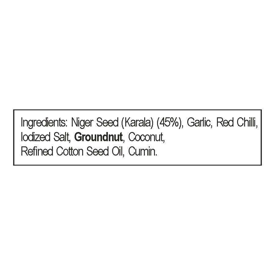 Ingredients: Niger Seed Garlic Red Chilli Powder Edible Common salt Graoundnut Coconut Cotton seed Oil Cumin Powder