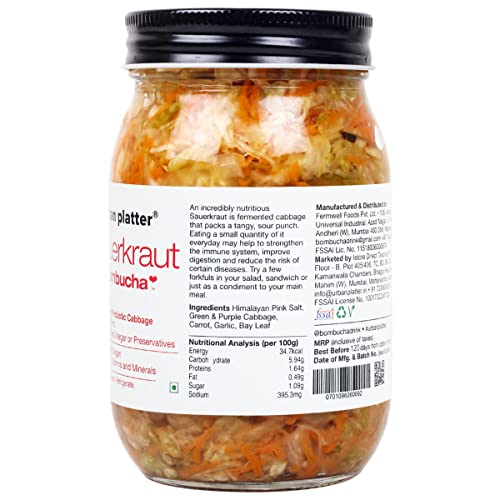 Our Carrot Sauerkraut is made with finely sliced green cabbage and carrots which has"pickled" by introducing to the mix a bacteria that produces lactic acid. Sauerkraut is rich in fiber vitamins and miner. Its probiotics o help your body absorb these nutrients more easily.It is a great source of probiotics which provide many health benefits. It o contains enzymes that help your body absorb nutrients more easily.With a taste profile that can be described as distinctly sour it is a result of these bacteria "eating up" the naturally occurring sugars in the cabbage and carrots.Sauerkraut promotes healthy flora and may increase the absorption of mood-regulating minerfrom your diet. Both of these help and maintain .Try a few forkfuls in your salad sandwich or just as a condiment to your meal.