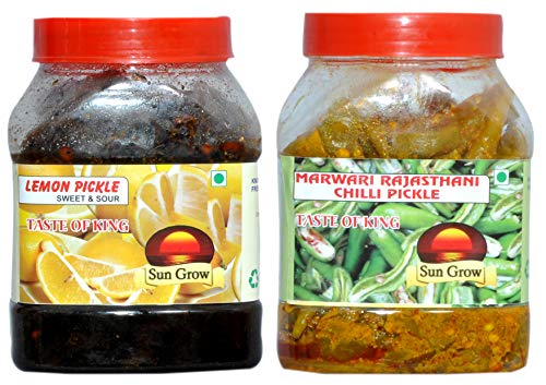 Sun Grow Combo-Home Made Organic Sweet and Sour Gujrati Lemon Pickle 1kg - & Home Made Organic Marwari Rajasthani Green Chilli Pickle