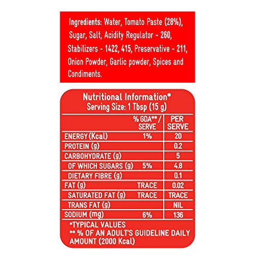 Tired of hitting and shaking the ketchup to get out of the bottle? The solution to a smooth serve comes in the form of Kissan Fresh Tomato Ketchup Squeezo. A gentle squeeze delivers just the right quantity of the ketchup on the plate without making a splatter! The pack is filled with the goodness of fresh and ripe tomatoes that liven the taste buds and the dish. Be assured Kissan Fresh Tomato ketchup is prepared using advanced manufacturing and the packaging technique of the Squeezo ensures there is no loss of taste and quality for a long time. Buy this convenient bottle right away!